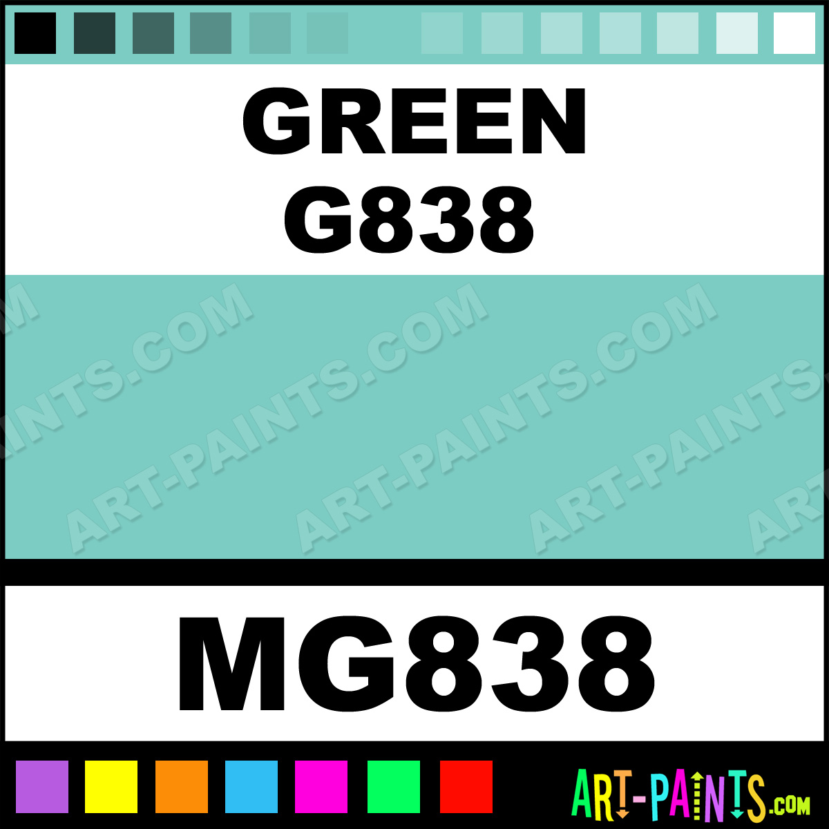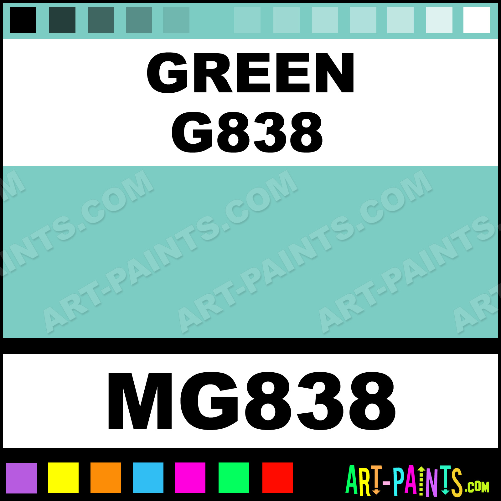 This beautiful Tria Pens Paint Marker shade is called Green G838, and comes from a company called Letraset. Their product number, along with the HTML color code, RGB, and CMYK codes are listed below. This Beautiful Shade of Green G838 and other Paintmarkers can be found in the Letraset Tria Pens Art Paint Marking Pen Gallery! Also be sure to browse through the other wonderful Paintmarker Professional Color Galleries to see more of Letraset Tria Pens Paint Marker Brand Paints and other Marking Pen Paint Manufacturers. And as always, Paint Paint Paint!  -Art-Paints.com
