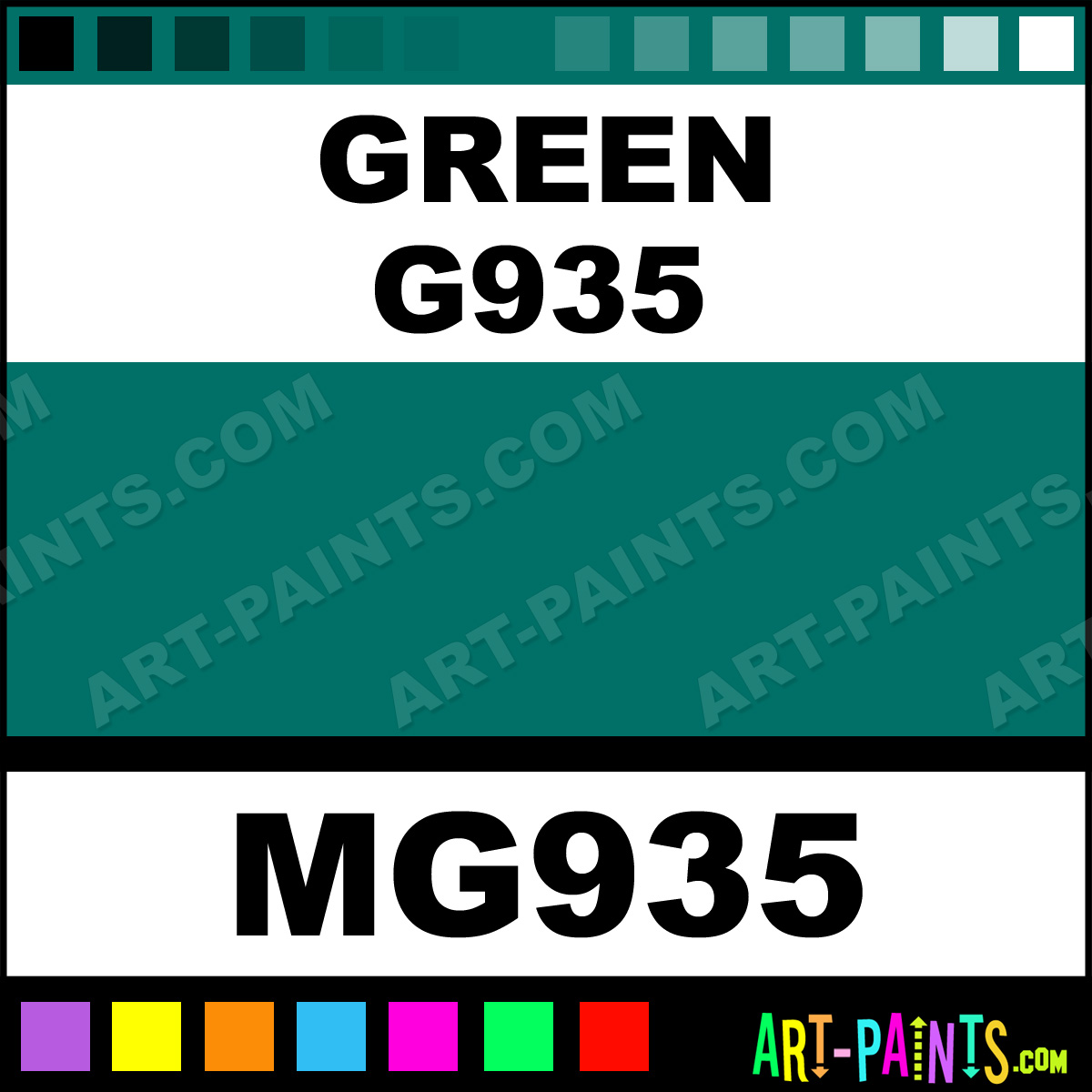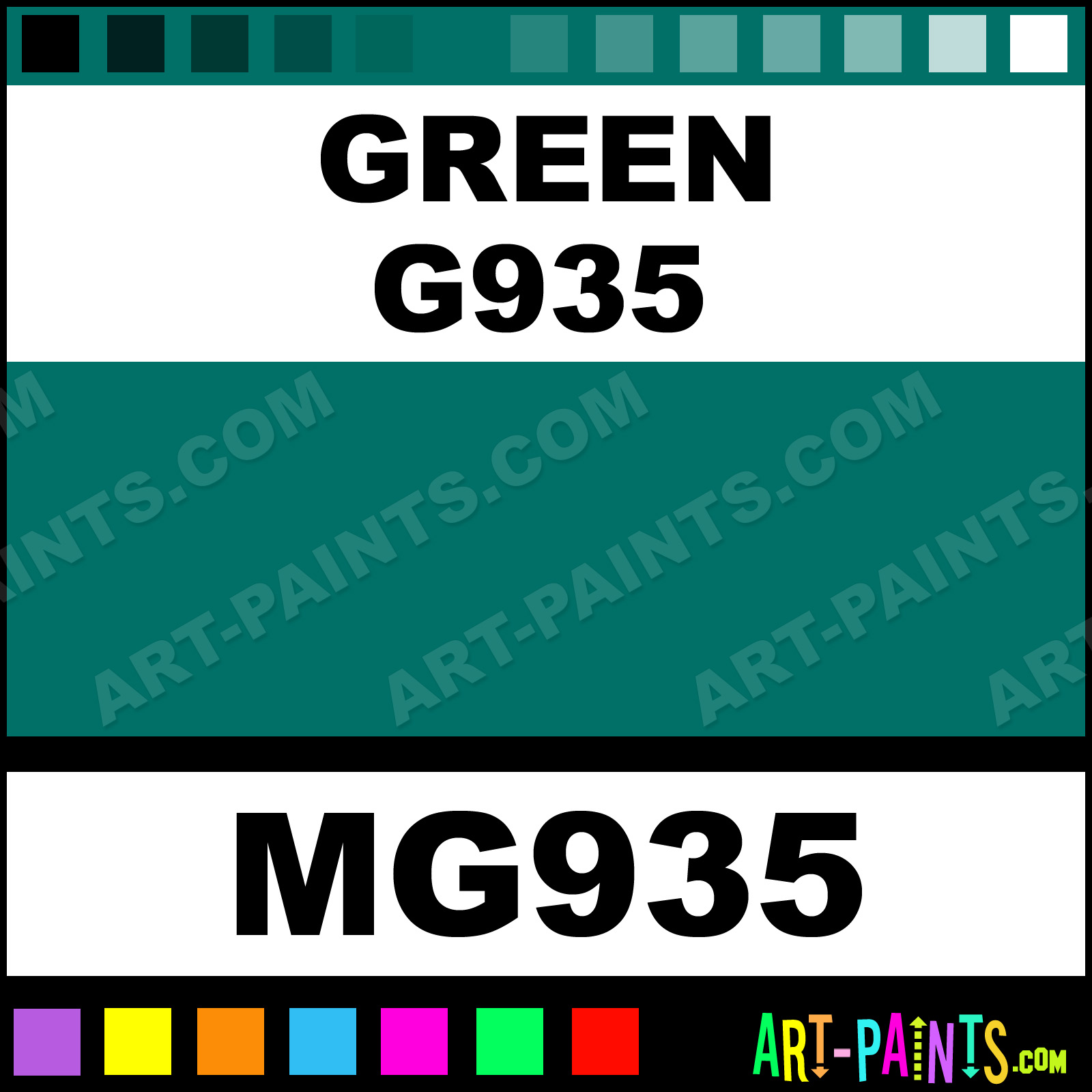 This beautiful Tria Pens Paint Marker shade is called Green G935, and comes from a company called Letraset. Their product number, along with the HTML color code, RGB, and CMYK codes are listed below. This Beautiful Shade of Green G935 and other Paintmarkers can be found in the Letraset Tria Pens Art Paint Marking Pen Gallery! Also be sure to browse through the other wonderful Paintmarker Professional Color Galleries to see more of Letraset Tria Pens Paint Marker Brand Paints and other Marking Pen Paint Manufacturers. And as always, Paint Paint Paint!  -Art-Paints.com