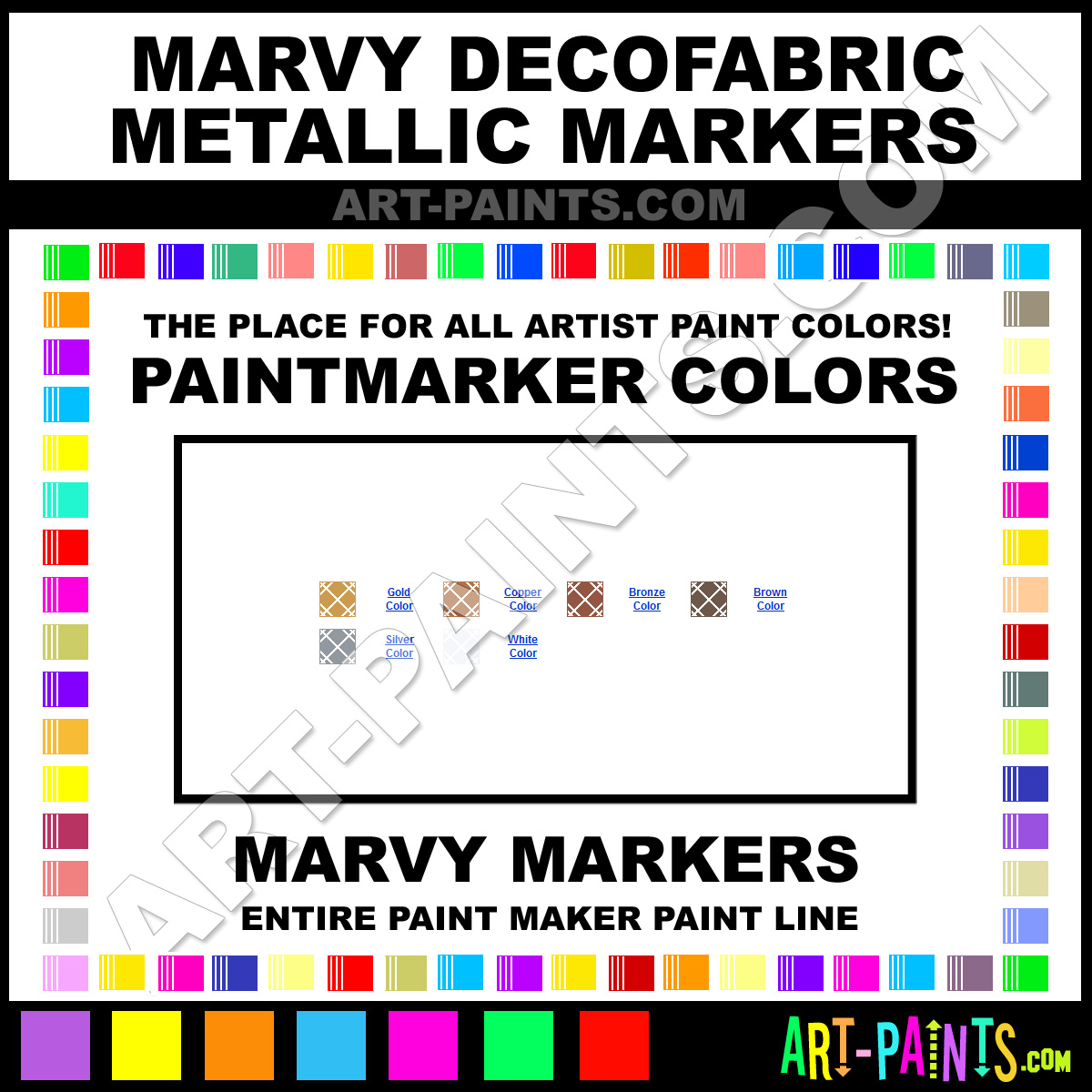 Marvy knows Paintmarkers and Paintmarker Paints! They make a wonderful brand of paint called Marvy DecoFabric Metallic Paint Marker Colors and Marking Pens that suits all types of artists. They strive to perfect the process of color and are one of the most popular Paintmarker Brand companies in the world. Enjoy their entire paint brand collection from the list below. Marvy makes wonderful Artists Paints that everyone is sure to enjoy! Choose an Paint Marker Paint Color below to view that Hue and all their great related paints.     -Art-Paints.com