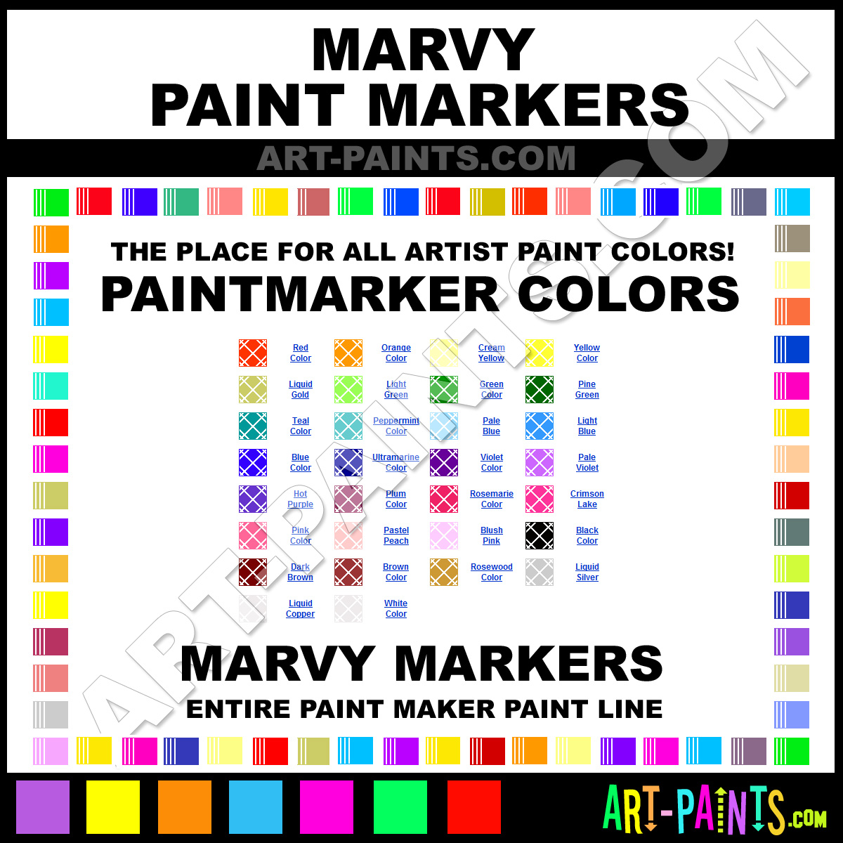 Marvy knows Paintmarker Paints and Marking Pens! They make wonderful brands of paint for all types of artists. They strive to perfect the process of color and are one of the most popular Paint Marker Brand companies in the world. Enjoy their entire brand collection from the list below. Marvy makes a couple different types of Paintmarker Paint Brands and Marking Pens including its Brush Markers Paint Markers, DecoColor Broad Paint Markers, DecoColor Extra Fine Paint Markers, DecoColor Fine Markers, DecoFabric Metallic Paint Markers, DecoFabric Primary Paint Markers, DecoFabric Secondary Paint Markers, Industrial Fine Paint Markers, Industrial Broad Paint Markers, and Metallic Markers Paint Markers! Choose an Paint Marker Paint type below to view that brand and all the related Color Paints and Hues in it.   -Art-Paints.com