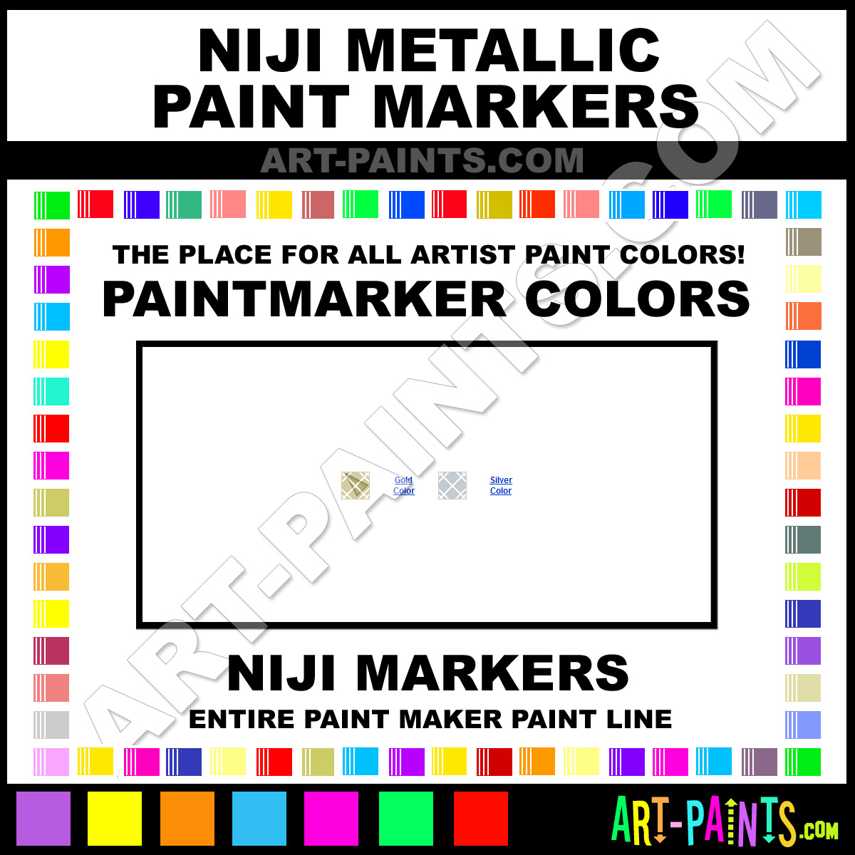 Niji knows Marker paints! They make a wonderful brand of paint called Niji Metallic Paint Marker's and Marking Pen Colors that suits all types of Paintmarker artists. They strive to perfect the process of color and are one of the most popular Paint Marker Brand companies in the world. Enjoy their entire paint brand collection from the list below. Niji makes wonderful Artists Paints that everyone is sure to enjoy! Choose a Paint Marker Paint Color below to view that Hue and all their great related color Paintmarkers.     -Art-Paints.com