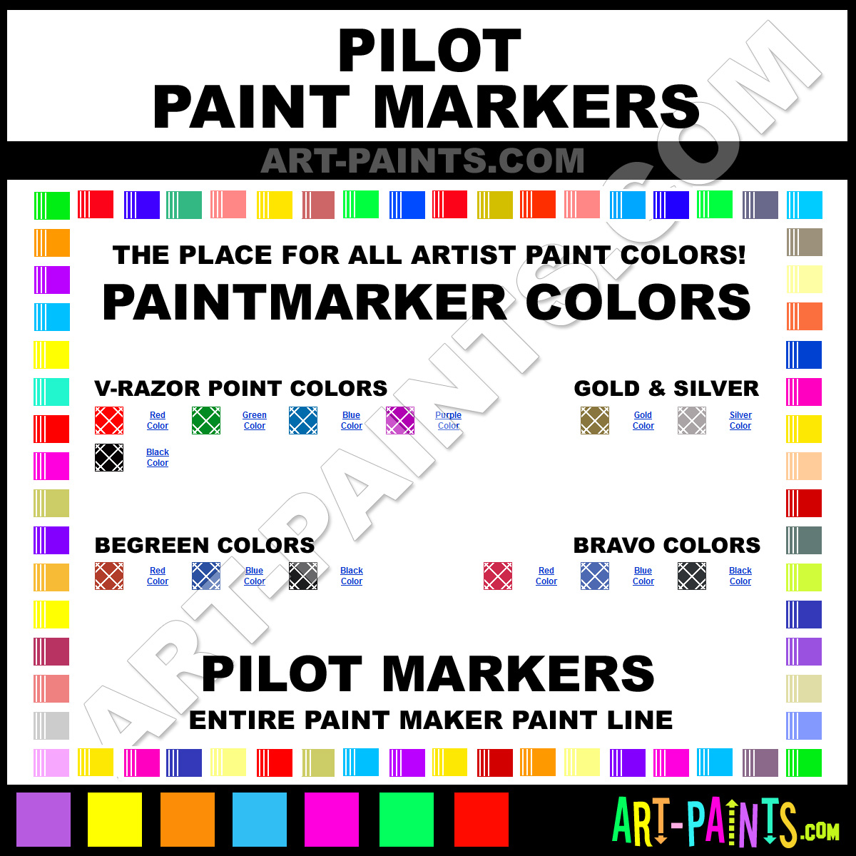 Pilot knows Paintmarker Paints and Marking Pens! They make wonderful brands of paint for all types of artists. They strive to perfect the process of color and are one of the most popular Paint Marker Brand companies in the world. Enjoy their entire brand collection from the list below. Pilot makes a couple different types of Paintmarker Paint Brands and Marking Pens including its V-Razor Point Paint Markers, BeGreen V Super Color Markers, Gold and Silver Markers and Bravo Paint Markers! Choose an Paint Marker Paint type below to view that brand and all the related Color Paints and Hues in it. Paint on!   -Art-Paints.com