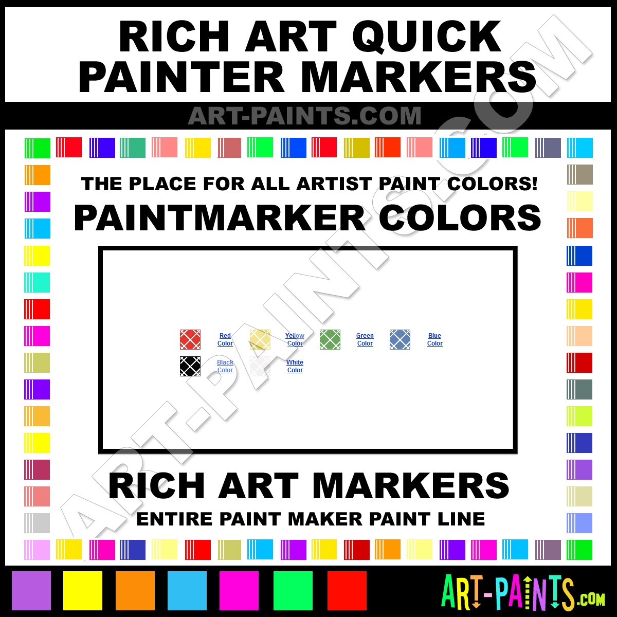 Rich Art knows Marker paints! They make a wonderful brand of paint called Rich Art Quick Painter Paint Marker's and Marking Pen Colors that suits all types of Paintmarker artists. They strive to perfect the process of color and are one of the most popular Paint Marker Brand companies in the world. Enjoy their entire paint brand collection from the list below. Rich Art makes wonderful Artists Paints that everyone is sure to enjoy! Choose a Paint Marker Paint Color below to view that Hue and all their great related color Paintmarker Paints. Paint on!     -Art-Paints.com
