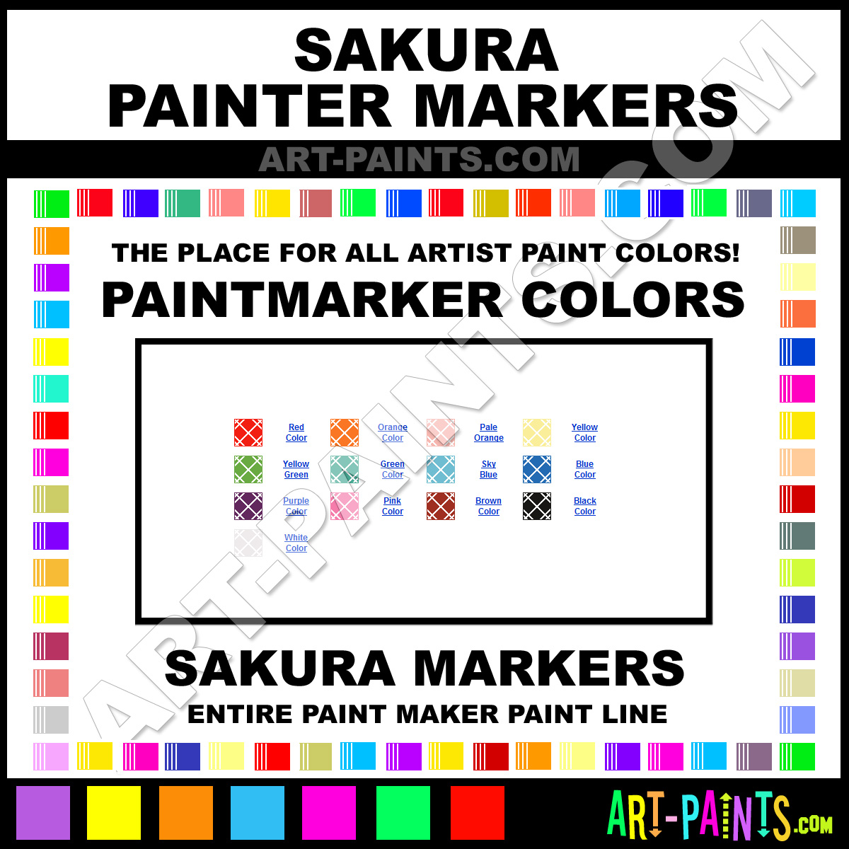 Sakura knows Paintmarker Paints and Marking Pens! They make wonderful brands of paint for all types of artists. They strive to perfect the process of color and are one of the most popular Paint Marker Brand companies in the world. Enjoy their entire brand collection from the list below. Sakura makes a couple different types of Paintmarker Paint Brands and Marking Pens including its Identi-Pen Dual Point Paint Markers, Metallic Pen Touch Markers, Pen Touch Markers, Pentouch Markers, Permapaque Opaque Markers, Pigma Brush Markers and Solid Paint Markers! Choose an Paint Marker Paint type below to view that brand and all the related Color Paints and Hues in it. Paint on!   -Art-Paints.com