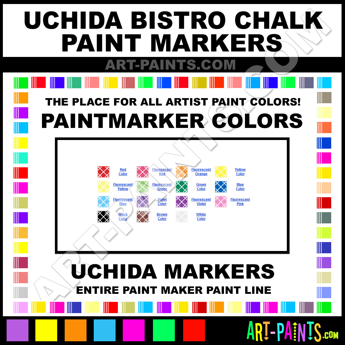 Uchida knows Paintmarkers and Paintmarker Paints! They make a wonderful brand of paint called Uchida Bistro Chalk Paint Marker Colors and Marking Pens that suits all types of artists. They strive to perfect the process of color and are one of the most popular Paintmarker Brand companies in the world. Enjoy their entire paint brand collection from the list below. Uchida makes wonderful Artists Paints that everyone is sure to enjoy! Choose an Paint Marker Paint Color below to view that Hue and all their great related color paints. Paint on!     -Art-Paints.com