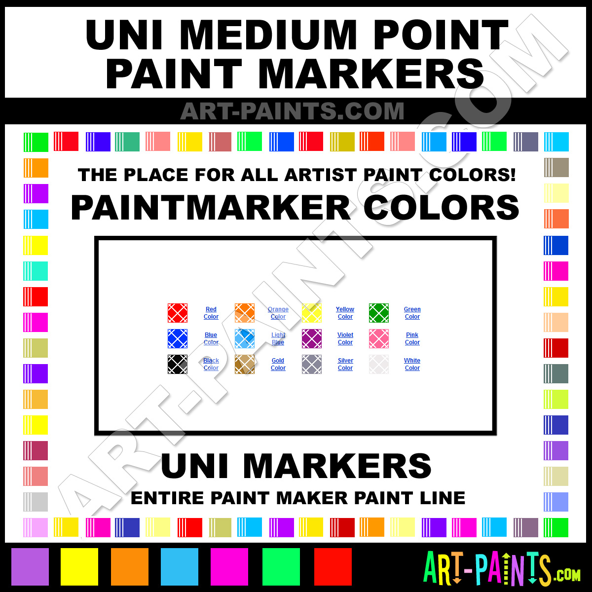 Uni knows Paintmarkers and Paintmarker Paints! They make a wonderful brand of paint called Uni Medium Point Paint Marker Colors and Marking Pens that suits all types of artists. They strive to perfect the process of color and are one of the most popular Paintmarker Brand companies in the world. Enjoy their entire paint brand collection from the list below. Uni makes wonderful Artists Paints that everyone is sure to enjoy! Choose an Paint Marker Paint Color below to view that Hue and all their great related color paints. Paint on!     -Art-Paints.com