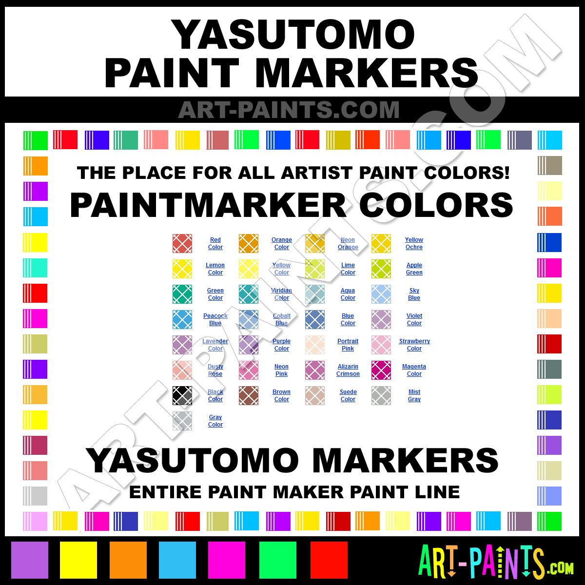 Yasutomo knows Paintmarker Paints and Marking Pens! They make wonderful brands of paint for all types of artists. They strive to perfect the process of color and are one of the most popular Paint Marker Brand companies in the world. Enjoy their entire brand collection from the list below. Yasutomo makes a couple different types of Paintmarker Paint Brands and Marking Pens including its Calligraphy Paint Markers and its Fabricmate Superfine Paint Markers! Choose an Paint Marker Paint type below to view that brand and all the related Color Paints and Hues in it. Paint on!   -Art-Paints.com