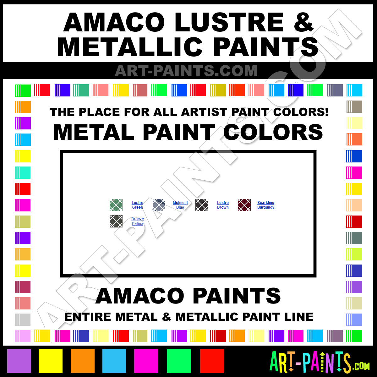 Amaco knows Metal Paints! They make a wonderful brand of paint called Amaco Lustre and Metallic Metal Paint Colors that suits all types of artists. Great for Painting on Metal or Paints that look Metallic, either way they strive to perfect the process of color and are one of the most popular Metal Paint Brand companies in the world. Enjoy their entire Paint Brand collection below. Amaco makes wonderful Artists Metallic Paints that everyone is sure to enjoy! Choose a Metal Paint Color below to view that Hue and Color.     -Art-Paints.com
