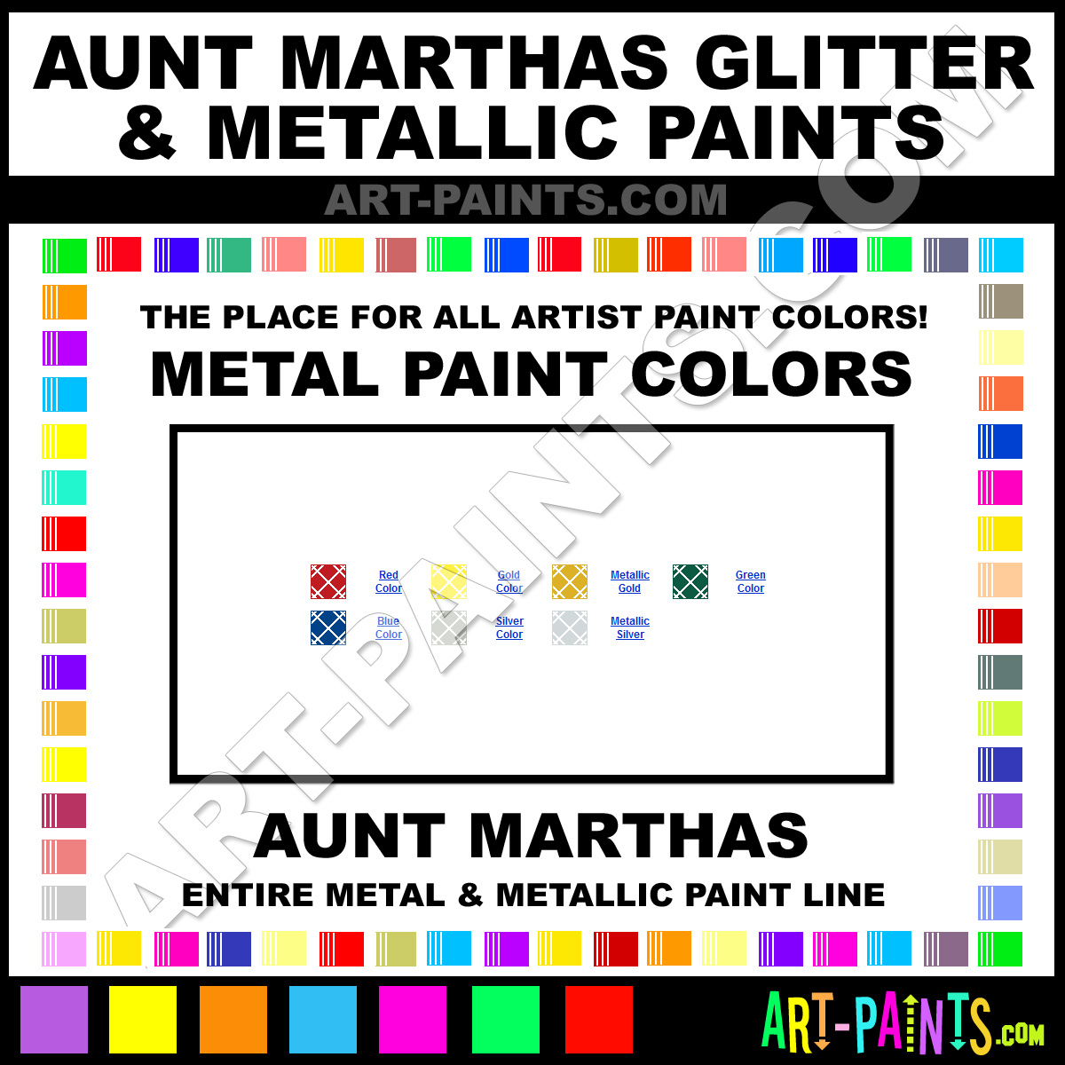 Aunt Marthas knows Metal Paints! They make a wonderful brand of paint called Aunt Marthas Glitter and Metallic Metal Paint Colors that suits all types of artists. Great for Painting on Metal or Paints that look Metallic, either way they strive to perfect the process of color and are one of the most popular Metal Paint Brand companies in the world. Enjoy their entire Paint Brand collection below. Aunt Marthas makes wonderful Artists Metallic Paints that everyone is sure to enjoy! Choose a Metal Paint below to view that Hue or Color.     -Art-Paints.com