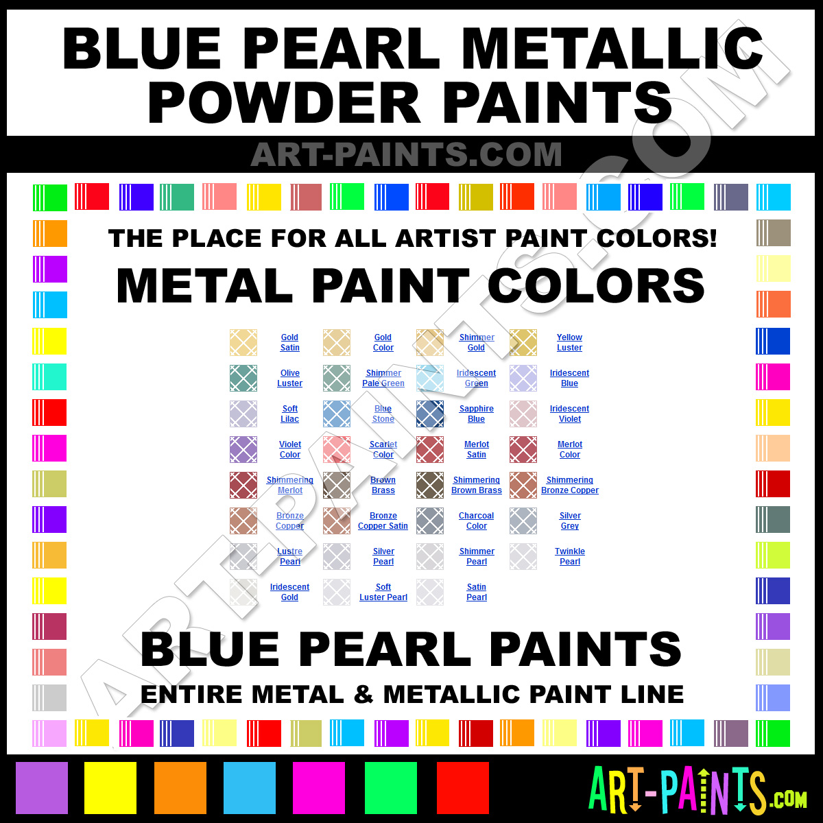 Blue Pearl knows Metal Paints! They make a wonderful brand of Paint called Blue Pearl Metallic Powders Metal Paint Colors that suits all types of artists. They strive to perfect the process of color, good for Metal surfaces or good for giving you that Metallic look! They are one of the most popular Metal Paint Brand companies in the world. Enjoy their entire paint brand collection below. Blue Pearl makes wonderful Artists Metal and Metallic Paints that everyone is sure to enjoy! Choose an Metal Paint Color below to view that Hue and Colors.     -Art-Paints.com