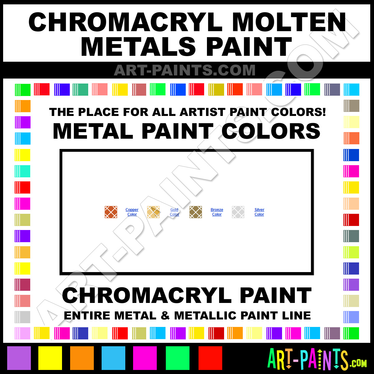 Chromacryl knows Metal Paints! They make a wonderful brand of paint called Chromacryl Molten Metals Metal Paint Colors that suits all types of artists. Great for Painting on Metal or Paints that look Metallic, either way they strive to perfect the process of color and are one of the most popular Metal Paint Brand companies in the world. Enjoy their entire Paint Brand collection below. Chromacryl makes wonderful Artists Metallic Paints that everyone is sure to enjoy! Choose a Metal Paint below to view that Hue or Color.     -Art-Paints.com