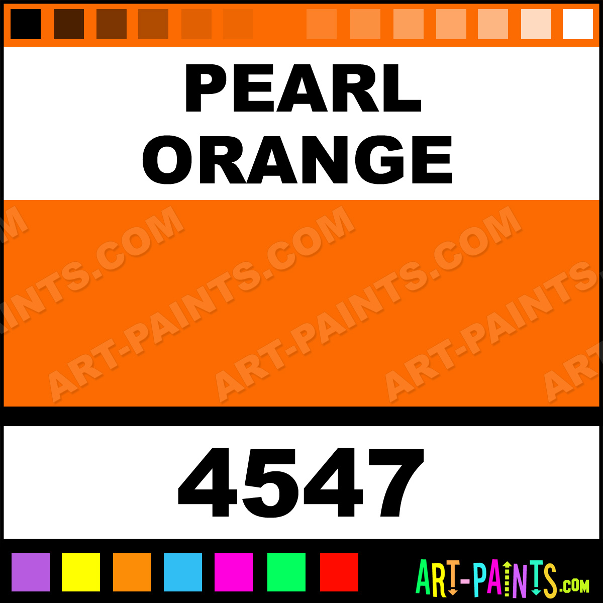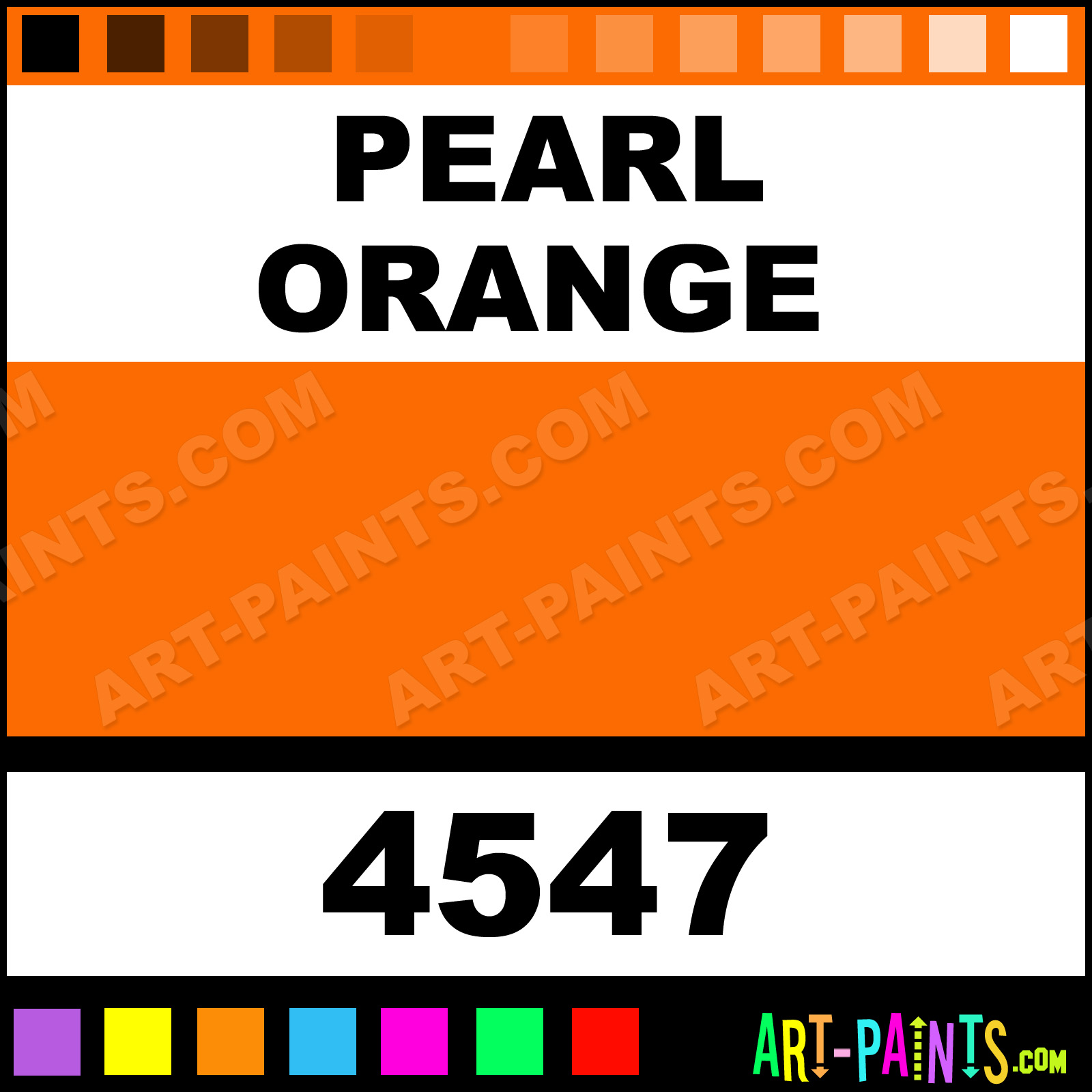 This beautiful Medium Body Metal or Metallic Paint shade is called Pearl Orange, and comes from a company called Createx. Their product number, along with the HTML color code, RGB, and CMYK codes are listed below. This Beautiful Shade of Pearl Orange and others can be found in the Createx Medium Body Art Paint Gallery! Also be sure to browse through the other wonderful Professional Color Galleries to see more of Createx Medium Body Metal Paints and other Metal and Metallic Paint Manufacturers.   -Art-Paints.com