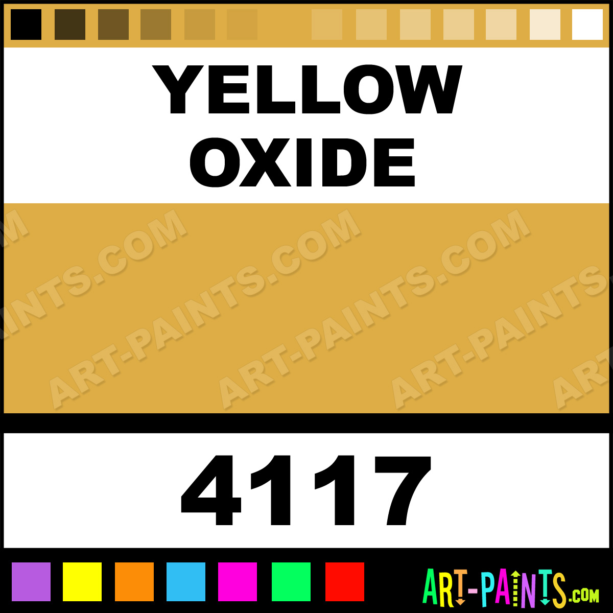 This beautiful Medium Body Metal or Metallic Paint shade is called Yellow Oxide, and comes from a company called Createx. Their product number, along with the HTML color code, RGB, and CMYK codes are listed below. This Beautiful Shade of Yellow Oxide and others can be found in the Createx Medium Body Art Paint Gallery! Also be sure to browse through the other wonderful Professional Color Galleries to see more of Createx Medium Body Metal Paints and other Metal and Metallic Paint Manufacturers.   -Art-Paints.com