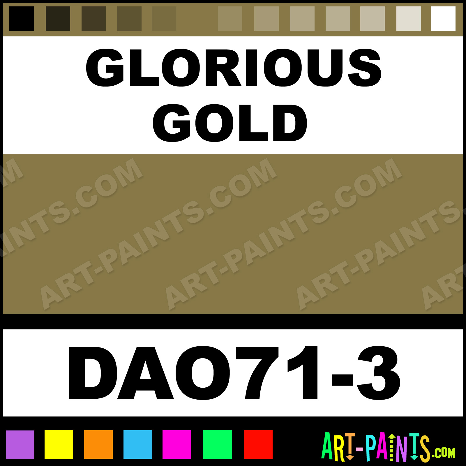 This beautiful Dazzling Metallics Metal Paint Color shade is called Glorious Gold, and comes from a company called DecoArt. Their product number, along with the HTML color code, RGB, and CMYK codes are listed below. This Beautiful Shade of Glorious Gold and other Metal and Metallic Paint Colors can be found in the DecoArt Dazzling Metallics Art Paint Gallery! Also be sure to browse through the other wonderful Professional Paint Color Galleries to see more of DecoArt Dazzling Metallics Metal Paints and other Metallic Paint Manufacturers.   -Art-Paints.com