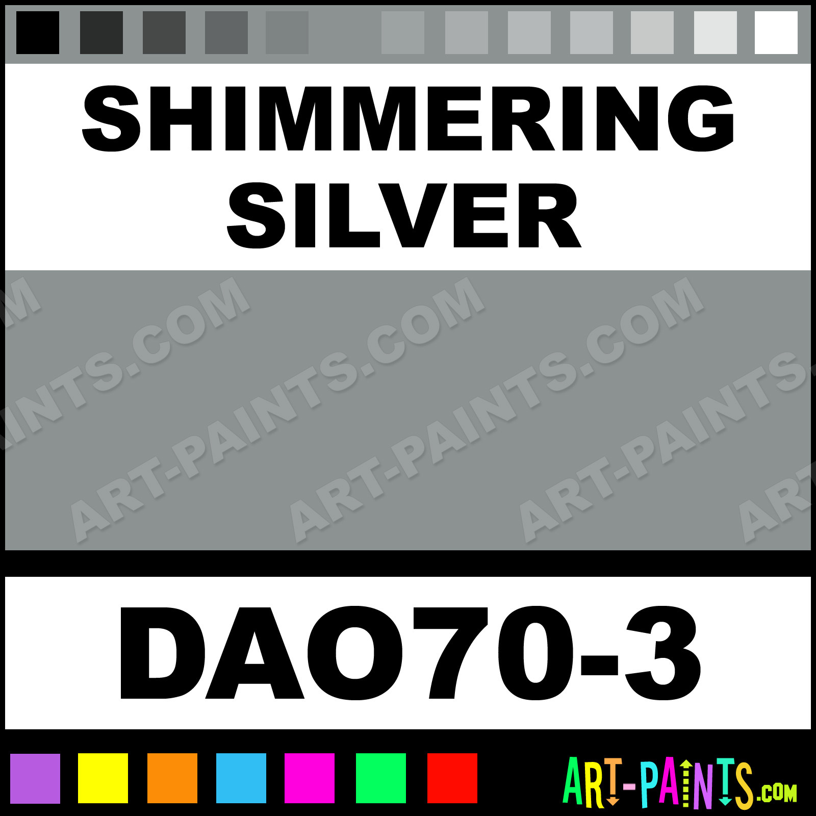 This beautiful Dazzling Metallics Metal Paint Color shade is called Shimmering Silver, and comes from a company called DecoArt. Their product number, along with the HTML color code, RGB, and CMYK codes are listed below. This Beautiful Shade of Shimmering Silver and other Metal and Metallic Paint Colors can be found in the DecoArt Dazzling Metallics Art Paint Gallery! Also be sure to browse through the other wonderful Professional Paint Color Galleries to see more of DecoArt Dazzling Metallics Metal Paints and other Metallic Paint Manufacturers.   -Art-Paints.com