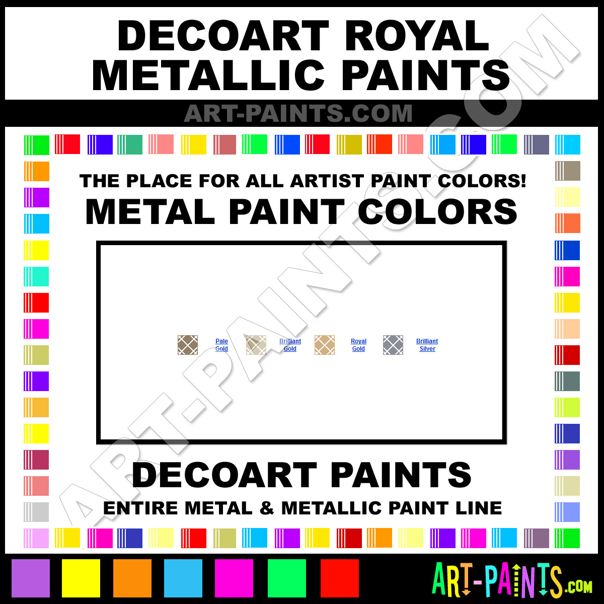 DecoArt knows Metal Paints! They make a wonderful brand of Paint called DecoArt Royal Metallics Metal Paint Colors that suits all types of artists. They strive to perfect the process of color, good for Metal surfaces or good for giving you that Metallic look! They are one of the most popular Metal Paint Brand companies in the world. Enjoy their entire paint brand collection below. DecoArt makes wonderful Artists Metal and Metallic Paints that everyone is sure to enjoy! Choose an Metal Paint Color below to view that Hue and Colors.     -Art-Paints.com