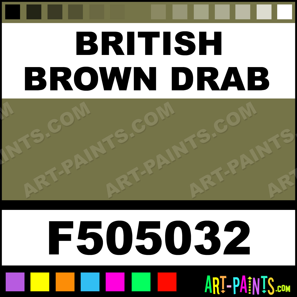 This beautiful Military Model Metal Paint Color shade is called British Brown Drab, and comes from a company called Floquil. Their product number, along with the HTML color code, RGB, and CMYK codes are listed below. This Beautiful Shade of British Brown Drab and other Metal and Metallic Paint Colors can be found in the Floquil Military Model Art Paint Gallery! Also be sure to browse through the other wonderful Professional Paint Color Galleries to see more of Floquil Military Model Metal Paints and other Metallic Paint Manufacturers.   -Art-Paints.com