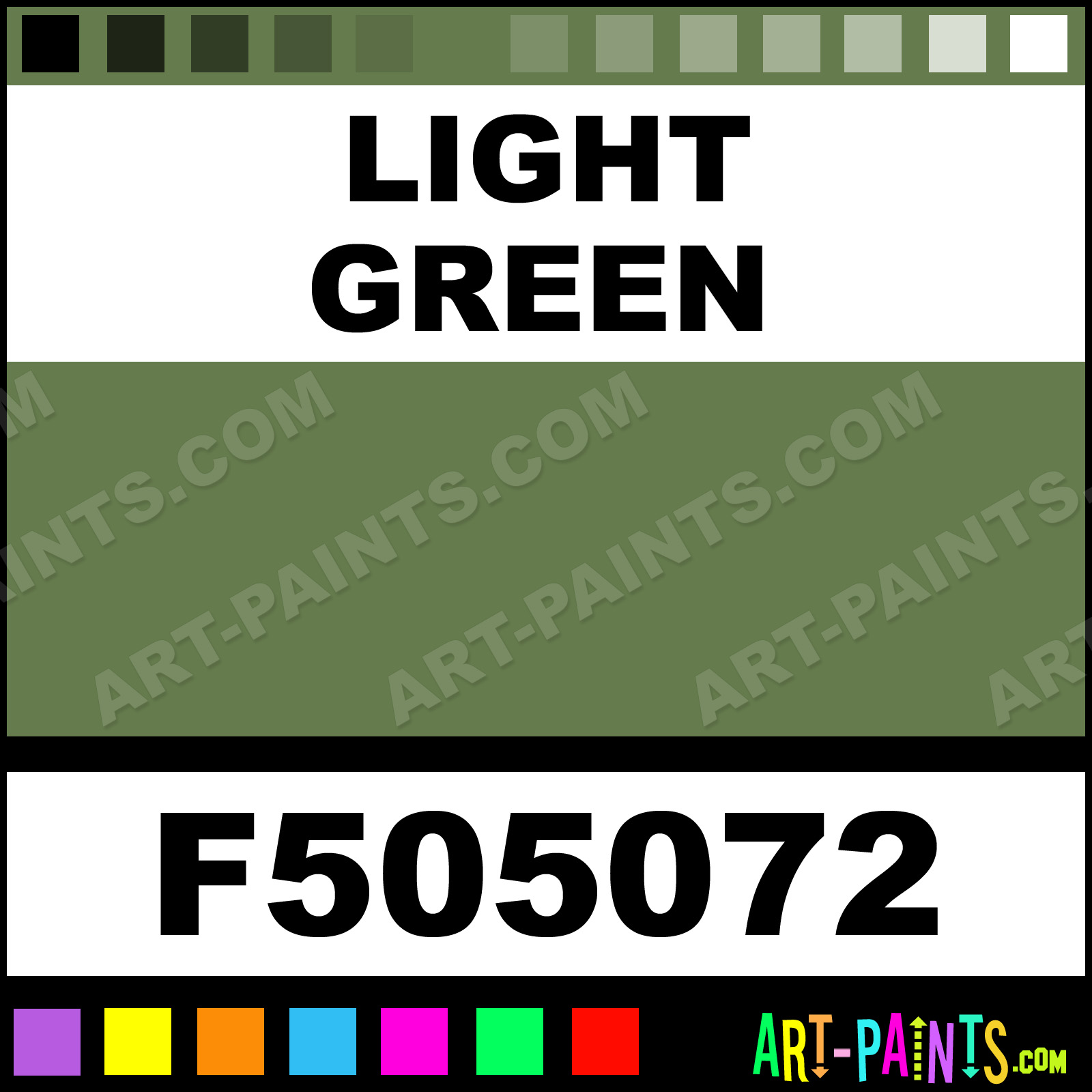 This beautiful Military Model Metal Paint Color shade is called Light Green, and comes from a company called Floquil. Their product number, along with the HTML color code, RGB, and CMYK codes are listed below. This Beautiful Shade of Light Green and other Metal and Metallic Paint Colors can be found in the Floquil Military Model Art Paint Gallery! Also be sure to browse through the other wonderful Professional Paint Color Galleries to see more of Floquil Military Model Metal Paints and other Metallic Paint Manufacturers.   -Art-Paints.com