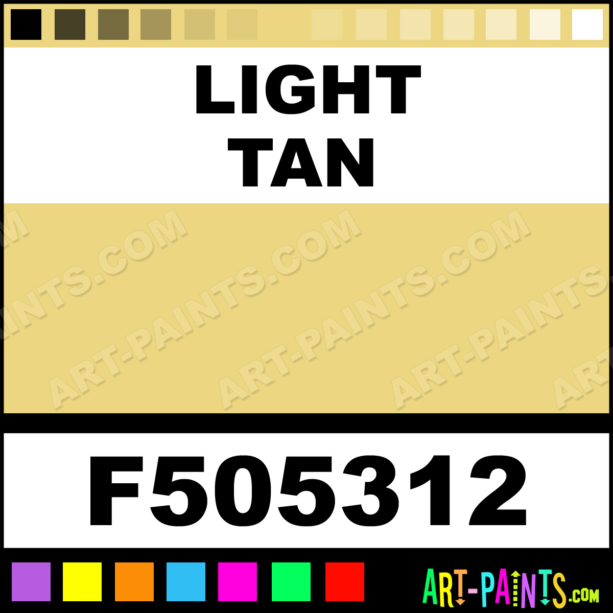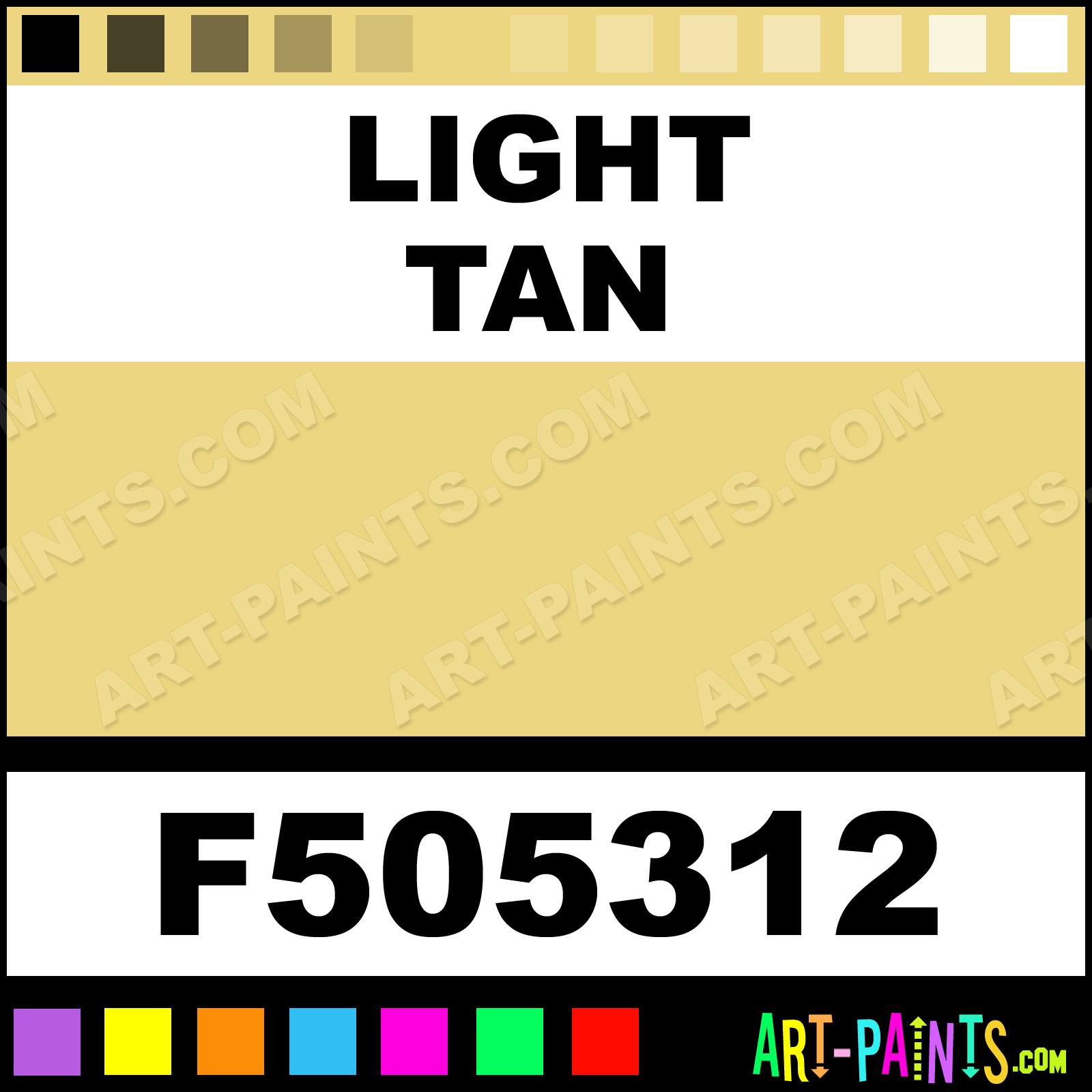 This beautiful Military Model Metal Paint Color shade is called Light Tan, and comes from a company called Floquil. Their product number, along with the HTML color code, RGB, and CMYK codes are listed below. This Beautiful Shade of Light Tan and other Metal and Metallic Paint Colors can be found in the Floquil Military Model Art Paint Gallery! Also be sure to browse through the other wonderful Professional Paint Color Galleries to see more of Floquil Military Model Metal Paints and other Metallic Paint Manufacturers.   -Art-Paints.com