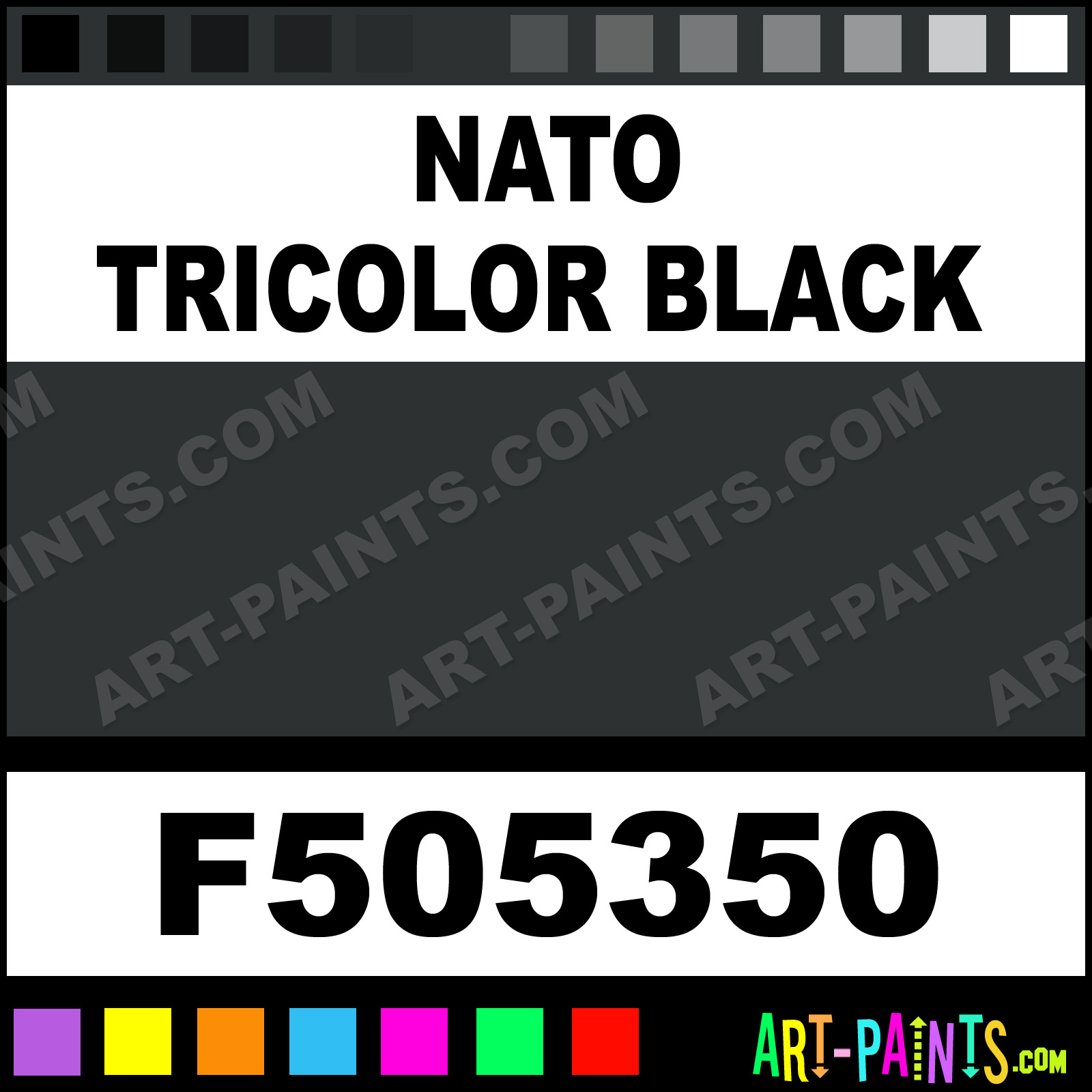 This beautiful Military Model Metal Paint Color shade is called Nato Tricolor Black, and comes from a company called Floquil. Their product number, along with the HTML color code, RGB, and CMYK codes are listed below. This Beautiful Shade of Nato Tricolor Black and other Metal and Metallic Paint Colors can be found in the Floquil Military Model Art Paint Gallery! Also be sure to browse through the other wonderful Professional Paint Color Galleries to see more of Floquil Military Model Metal Paints and other Metallic Paint Manufacturers.   -Art-Paints.com