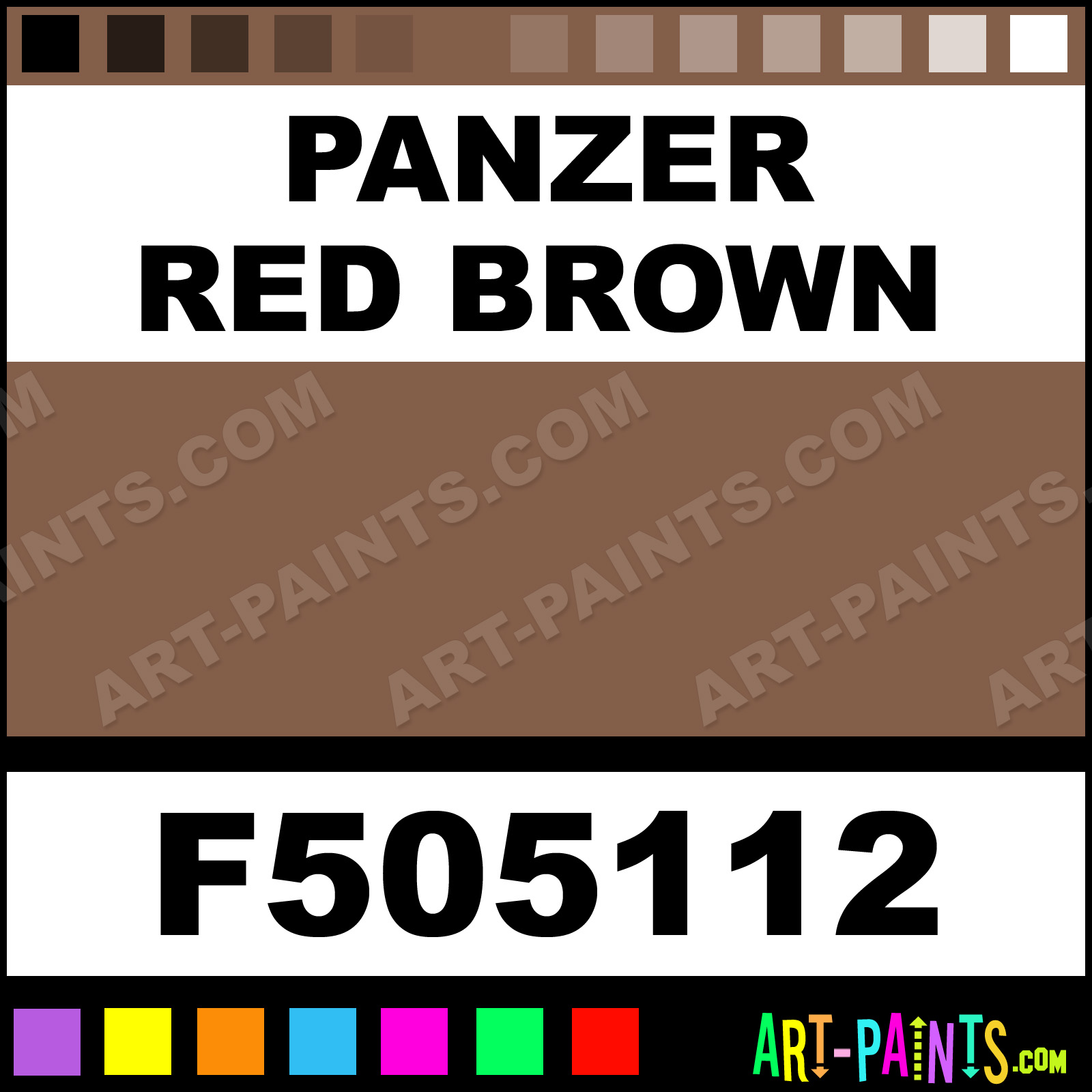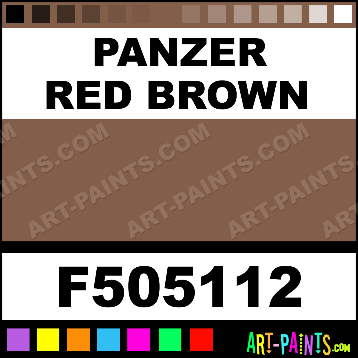 This beautiful Military Model Metal Paint Color shade is called Panzer Red Brown, and comes from a company called Floquil. Their product number, along with the HTML color code, RGB, and CMYK codes are listed below. This Beautiful Shade of Panzer Red Brown and other Metal and Metallic Paint Colors can be found in the Floquil Military Model Art Paint Gallery! Also be sure to browse through the other wonderful Professional Paint Color Galleries to see more of Floquil Military Model Metal Paints and other Metallic Paint Manufacturers.   -Art-Paints.com