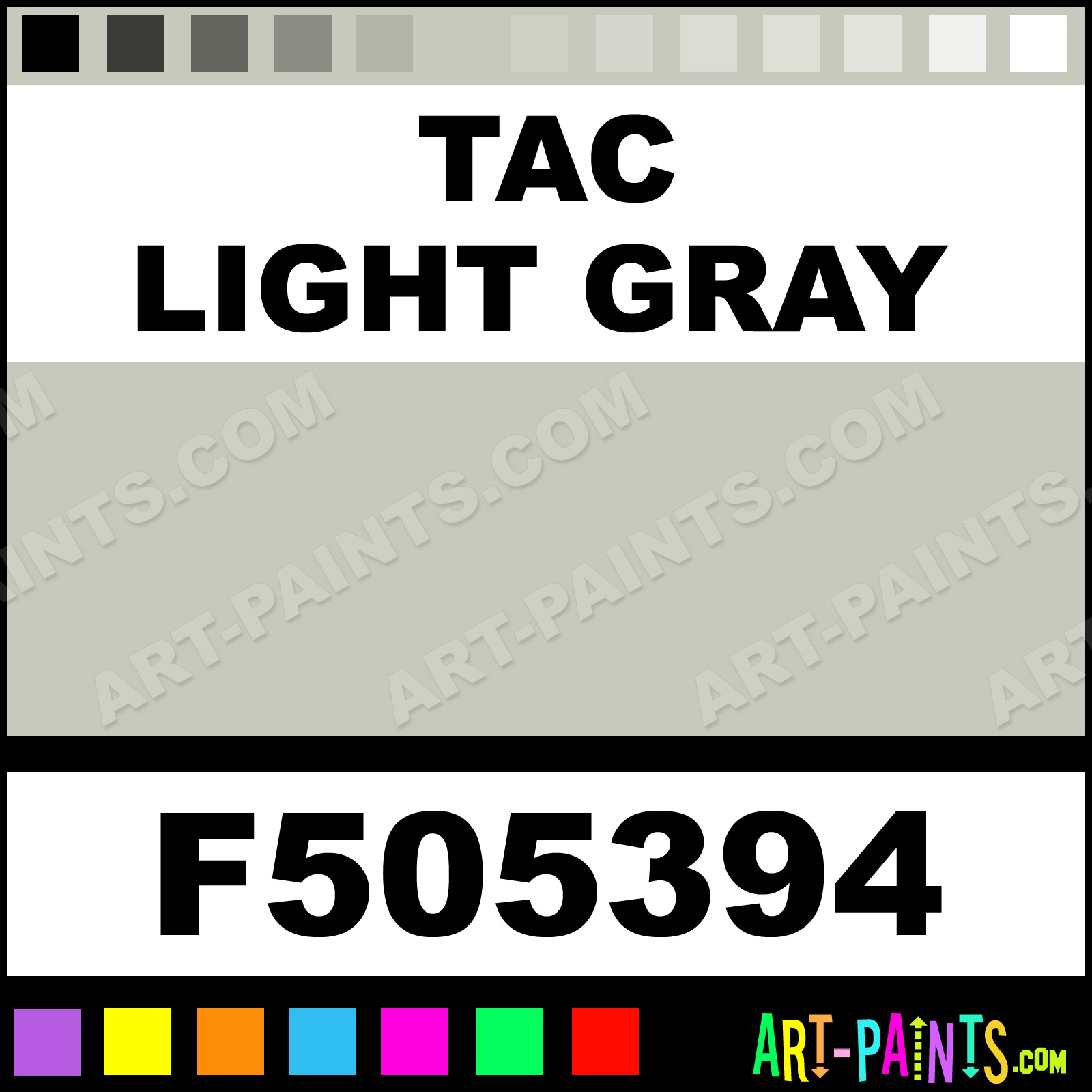 This beautiful Military Model Metal Paint Color shade is called TAC Light Gray, and comes from a company called Floquil. Their product number, along with the HTML color code, RGB, and CMYK codes are listed below. This Beautiful Shade of TAC Light Gray and other Metal and Metallic Paint Colors can be found in the Floquil Military Model Art Paint Gallery! Also be sure to browse through the other wonderful Professional Paint Color Galleries to see more of Floquil Military Model Metal Paints and other Metallic Paint Manufacturers.   -Art-Paints.com