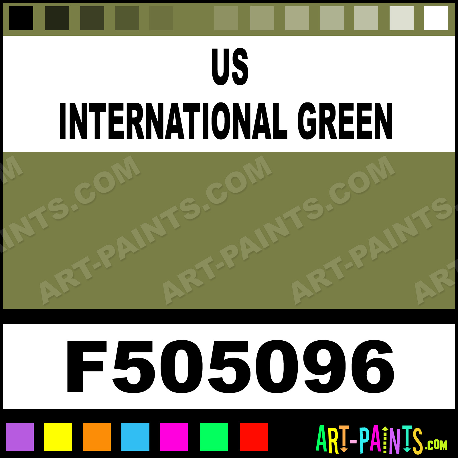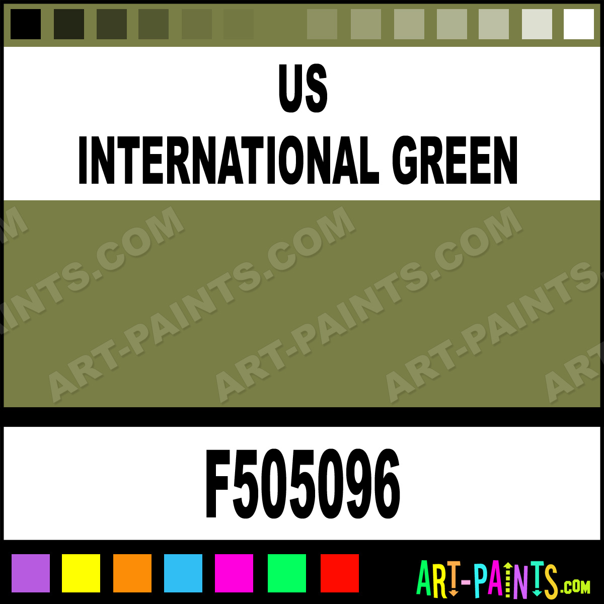 This beautiful Military Model Metal Paint Color shade is called US International Green, and comes from a company called Floquil. Their product number, along with the HTML color code, RGB, and CMYK codes are listed below. This Beautiful Shade of US International Green and other Metal and Metallic Paint Colors can be found in the Floquil Military Model Art Paint Gallery! Also be sure to browse through the other wonderful Professional Paint Color Galleries to see more of Floquil Military Model Metal Paints and other Metallic Paint Manufacturers.   -Art-Paints.com