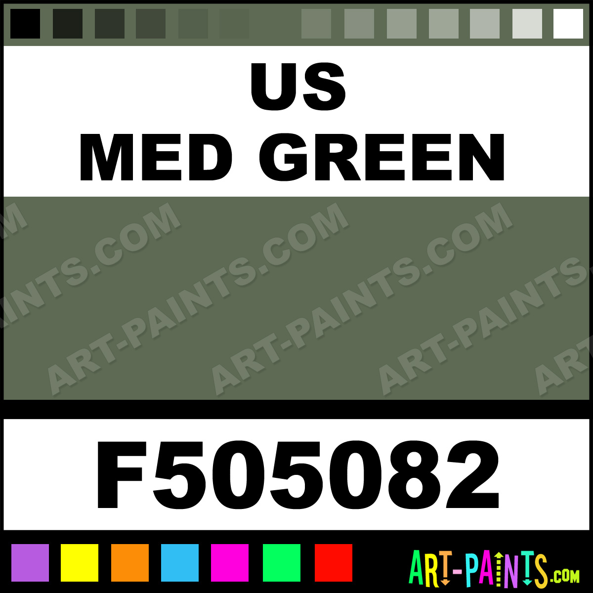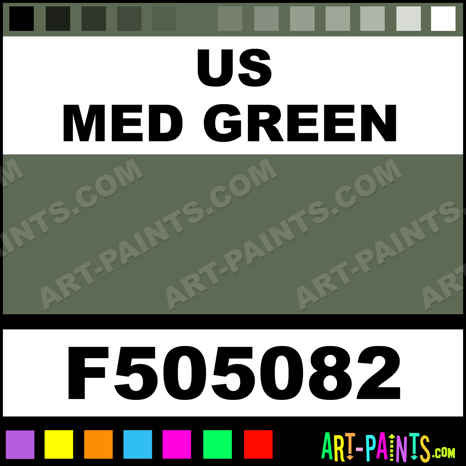 This beautiful Military Model Metal Paint Color shade is called US Med Green, and comes from a company called Floquil. Their product number, along with the HTML color code, RGB, and CMYK codes are listed below. This Beautiful Shade of US Med Green and other Metal and Metallic Paint Colors can be found in the Floquil Military Model Art Paint Gallery! Also be sure to browse through the other wonderful Professional Paint Color Galleries to see more of Floquil Military Model Metal Paints and other Metallic Paint Manufacturers.   -Art-Paints.com