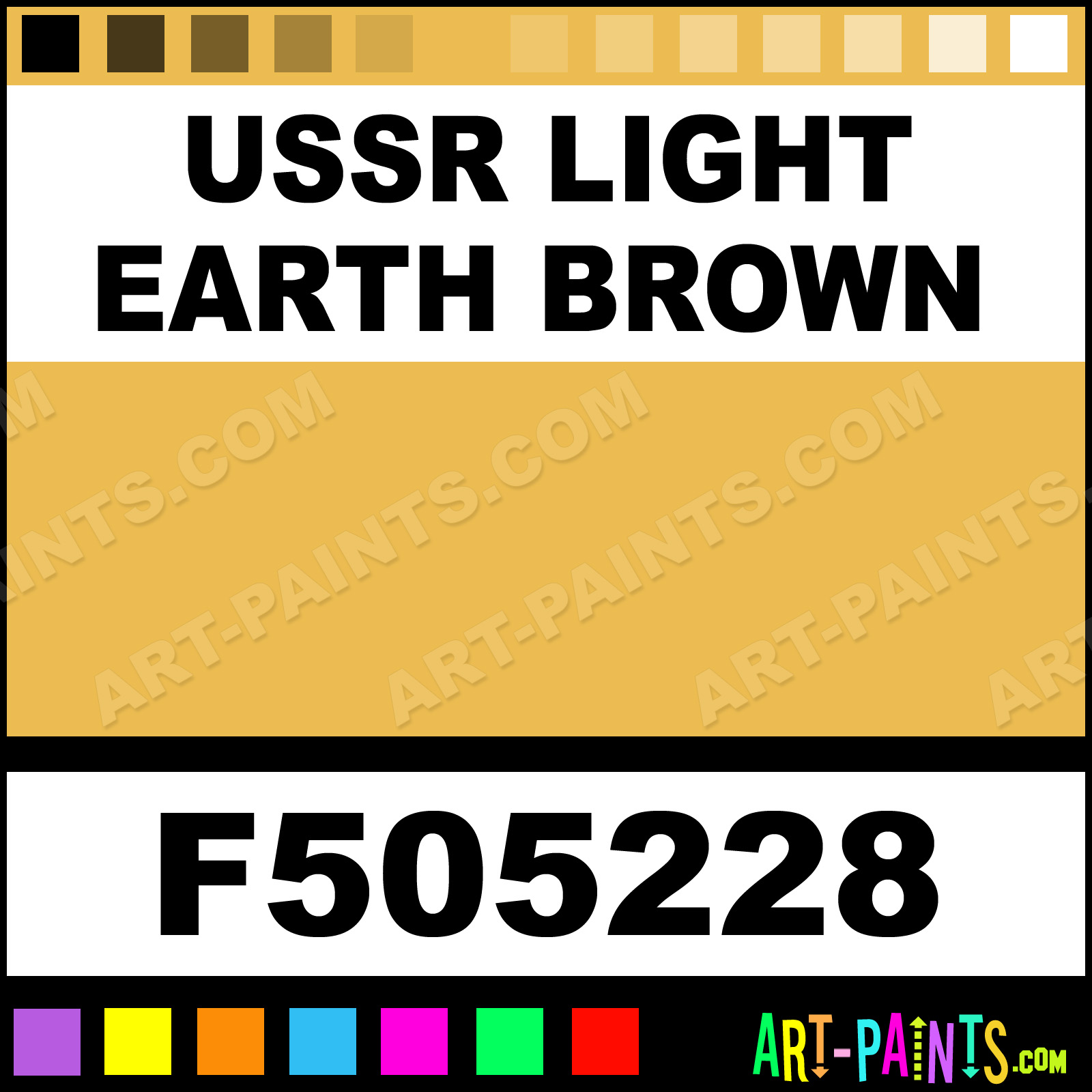 This beautiful Military Model Metal Paint Color shade is called USSR Light Earth Brown, and comes from a company called Floquil. Their product number, along with the HTML color code, RGB, and CMYK codes are listed below. This Beautiful Shade of USSR Light Earth Brown and other Metal and Metallic Paint Colors can be found in the Floquil Military Model Art Paint Gallery! Also be sure to browse through the other wonderful Professional Paint Color Galleries to see more of Floquil Military Model Metal Paints and other Metallic Paint Manufacturers.   -Art-Paints.com