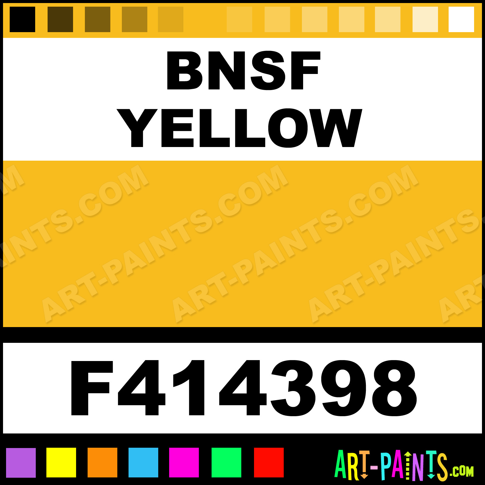 This beautiful Railroad Metal Paint Color shade is called BNSF Yellow, and comes from a company called Floquil. Their product number, along with the HTML color code, RGB, and CMYK codes are listed below. This Beautiful Shade of BNSF Yellow and other Metal and Metallic Paint Colors can be found in the Floquil Railroad Art Paint Gallery! Also be sure to browse through the other wonderful Professional Paint Color Galleries to see more of Floquil Railroad Metal Paints and other Metallic Paint Manufacturers.   -Art-Paints.com