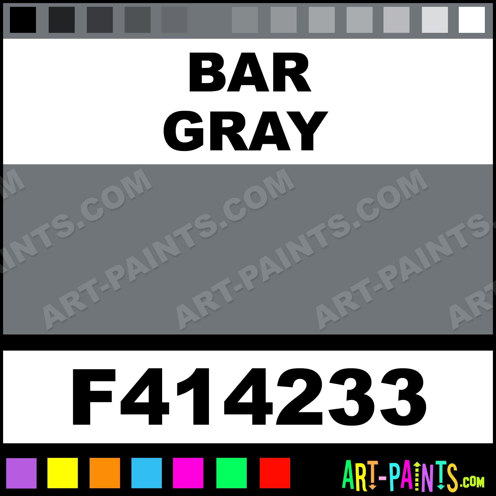 This beautiful Railroad Metal Paint Color shade is called Bar Gray, and comes from a company called Floquil. Their product number, along with the HTML color code, RGB, and CMYK codes are listed below. This Beautiful Shade of Bar Gray and other Metal and Metallic Paint Colors can be found in the Floquil Railroad Art Paint Gallery! Also be sure to browse through the other wonderful Professional Paint Color Galleries to see more of Floquil Railroad Metal Paints and other Metallic Paint Manufacturers.   -Art-Paints.com