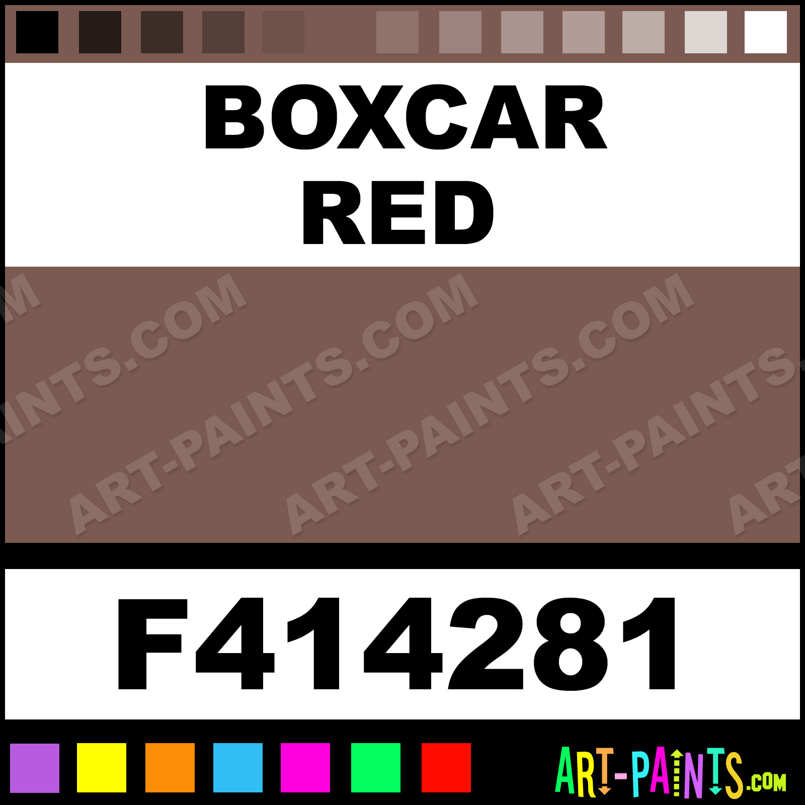 This beautiful Railroad Metal Paint Color shade is called Boxcar Red, and comes from a company called Floquil. Their product number, along with the HTML color code, RGB, and CMYK codes are listed below. This Beautiful Shade of Boxcar Red and other Metal and Metallic Paint Colors can be found in the Floquil Railroad Art Paint Gallery! Also be sure to browse through the other wonderful Professional Paint Color Galleries to see more of Floquil Railroad Metal Paints and other Metallic Paint Manufacturers.   -Art-Paints.com
