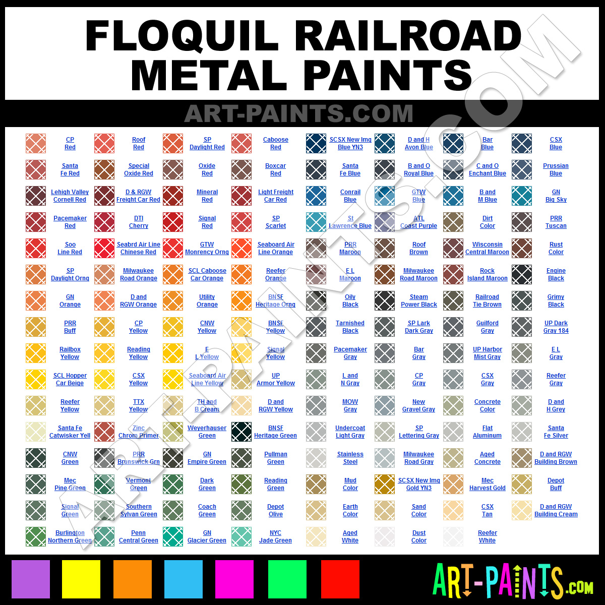Floquil knows Metal Paints! They make a wonderful brand of Paint called Floquil Railroad Metal Paint Colors that suits all types of artists. They strive to perfect the process of color, good for Metal surfaces or good for giving you that Metallic look! They are one of the most popular Metal Paint Brand companies in the world. Enjoy their entire paint brand collection below. Floquil makes wonderful Artists Metal and Metallic Paints that everyone is sure to enjoy! Choose an Metal Paint Color below to view that Hue and Colors.     -Art-Paints.com