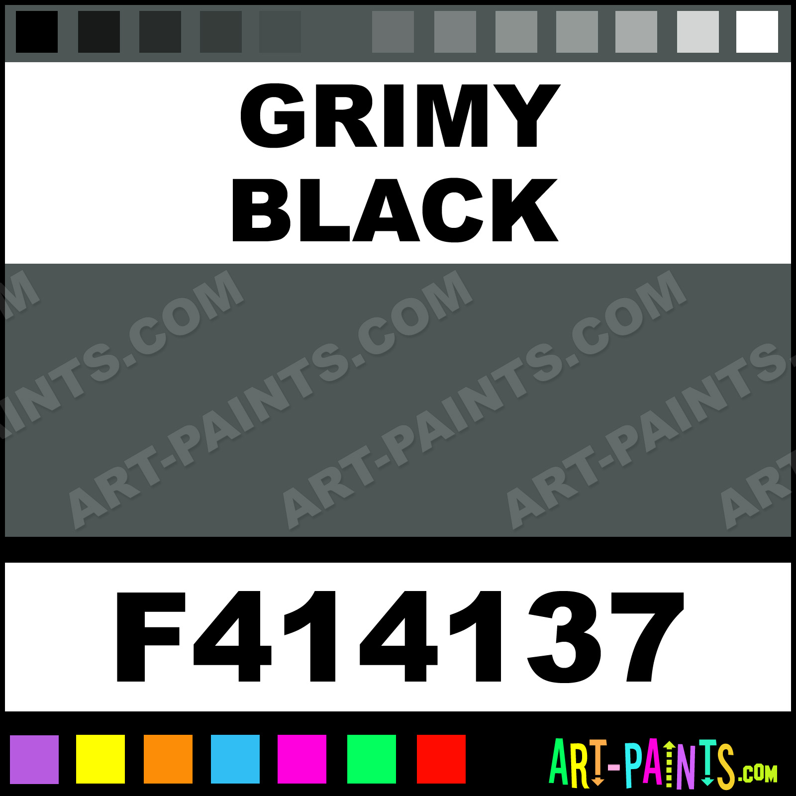 This beautiful Railroad Metal Paint Color shade is called Grimy Black, and comes from a company called Floquil. Their product number, along with the HTML color code, RGB, and CMYK codes are listed below. This Beautiful Shade of Grimy Black and other Metal and Metallic Paint Colors can be found in the Floquil Railroad Art Paint Gallery! Also be sure to browse through the other wonderful Professional Paint Color Galleries to see more of Floquil Railroad Metal Paints and other Metallic Paint Manufacturers.   -Art-Paints.com