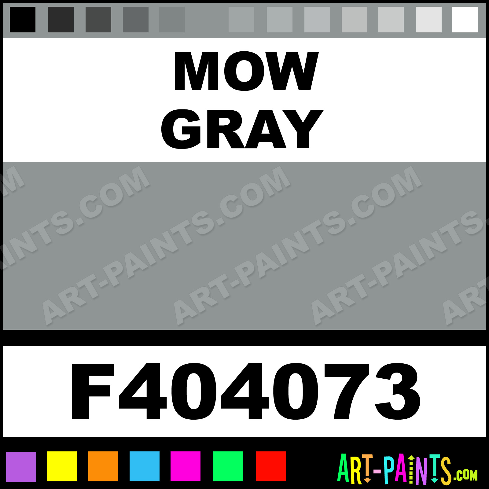 This beautiful Railroad Metal Paint Color shade is called MOW Gray, and comes from a company called Floquil. Their product number, along with the HTML color code, RGB, and CMYK codes are listed below. This Beautiful Shade of MOW Gray and other Metal and Metallic Paint Colors can be found in the Floquil Railroad Art Paint Gallery! Also be sure to browse through the other wonderful Professional Paint Color Galleries to see more of Floquil Railroad Metal Paints and other Metallic Paint Manufacturers.   -Art-Paints.com