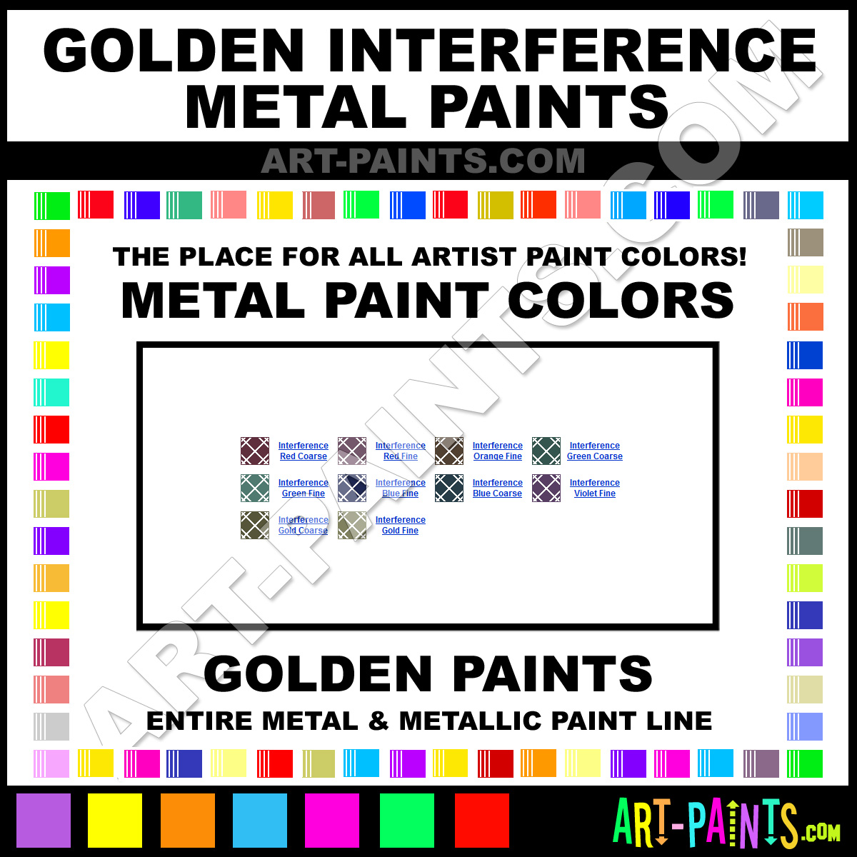 Golden knows Metal Paints! They make a wonderful brand of Paint called Golden Interference Metal Paint Colors that suits all types of artists. They strive to perfect the process of color, good for Metal surfaces or good for giving you that Metallic look! They are one of the most popular Metal Paint Brand companies in the world. Enjoy their entire paint brand collection below. Golden makes wonderful Artists Metal and Metallic Paints that everyone is sure to enjoy! Choose an Metal Paint Color below to view that Hue and Colors.     -Art-Paints.com