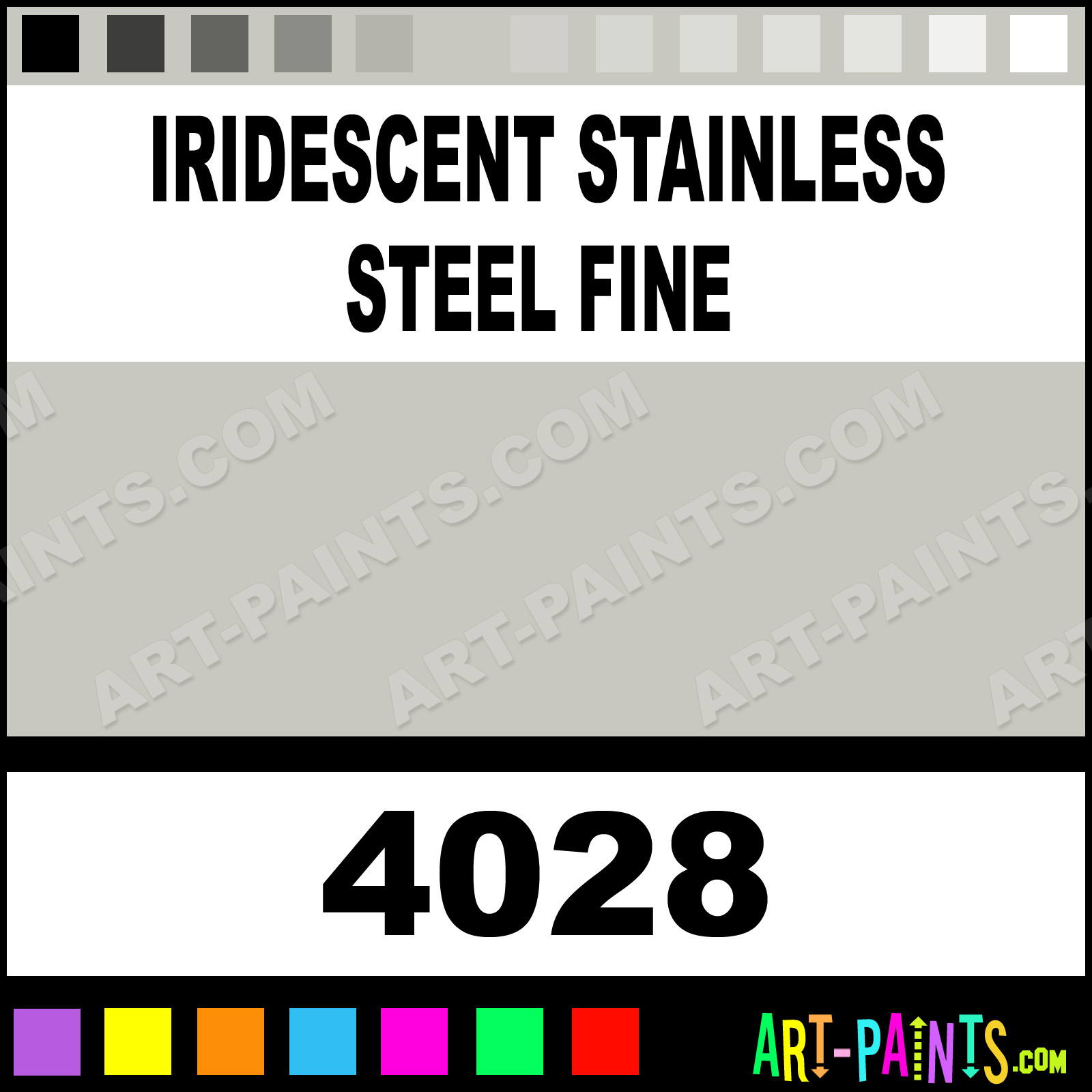 This beautiful Iridescent Metal Paint Color shade is called Iridescent Stainless Steel Fine, and comes from a company called Golden. Their product number, along with the HTML color code, RGB, and CMYK codes are listed below. This Beautiful Shade of Iridescent Stainless Steel Fine and other Metal and Metallic Paint Colors can be found in the Golden Iridescent Art Paint Gallery! Also be sure to browse through the other wonderful Professional Paint Color Galleries to see more of Golden Iridescent Metal Paints and other Metallic Paint Manufacturers.   -Art-Paints.com