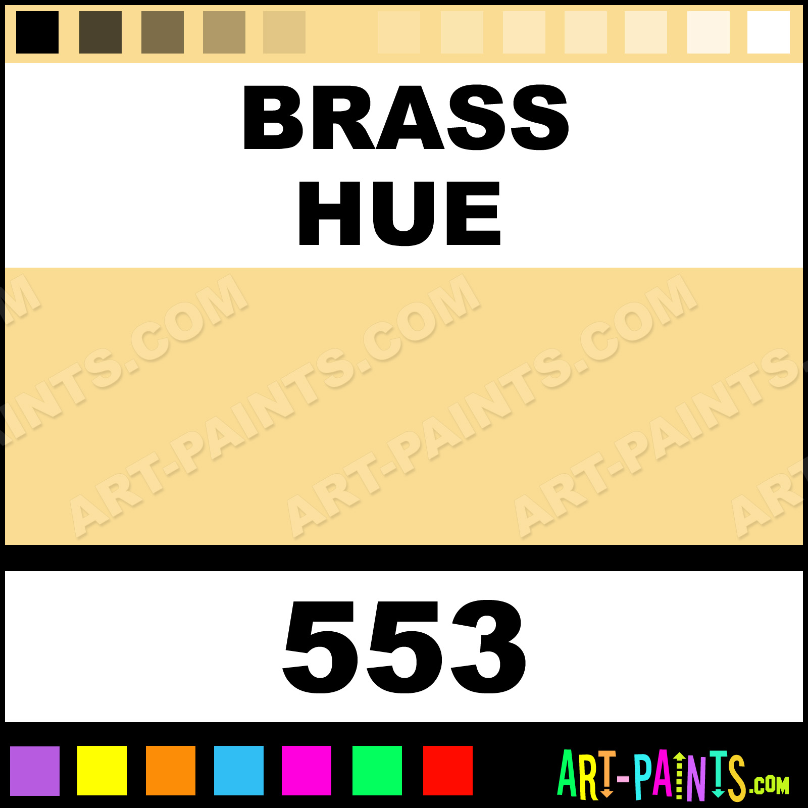 This beautiful Fabric Lumiere Metal Paint Color shade is called Brass, and comes from a company called Jacquard. Their product number, along with the HTML color code, RGB, and CMYK codes are listed below. This Beautiful Shade of Brass and other Metal and Metallic Paint Colors can be found in the Jacquard Fabric Lumiere Art Paint Gallery! Also be sure to browse through the other wonderful Professional Paint Color Galleries to see more of Jacquard Fabric Lumiere Metal Paints and other Metallic Paint Manufacturers.   -Art-Paints.com