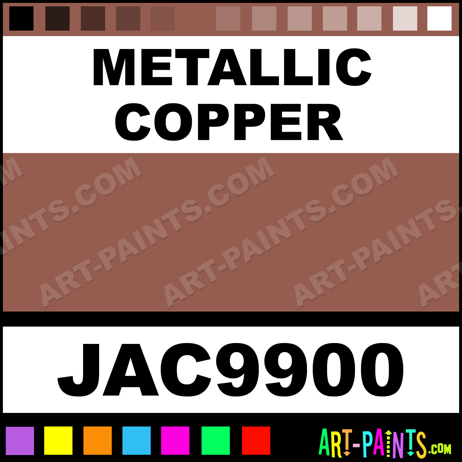 This beautiful Lumiere and Neopaque Metal Paint Color shade is called Metallic Copper, and comes from a company called Jacquard. Their product number, along with the HTML color code, RGB, and CMYK codes are listed below. This Beautiful Shade of Metallic Copper and other Metal and Metallic Paint Colors can be found in the Jacquard Lumiere and Neopaque Art Paint Gallery! Also be sure to browse through the other wonderful Professional Paint Color Galleries to see more of Jacquard Lumiere and Neopaque Metal Paints and other Metallic Paint Manufacturers.   -Art-Paints.com