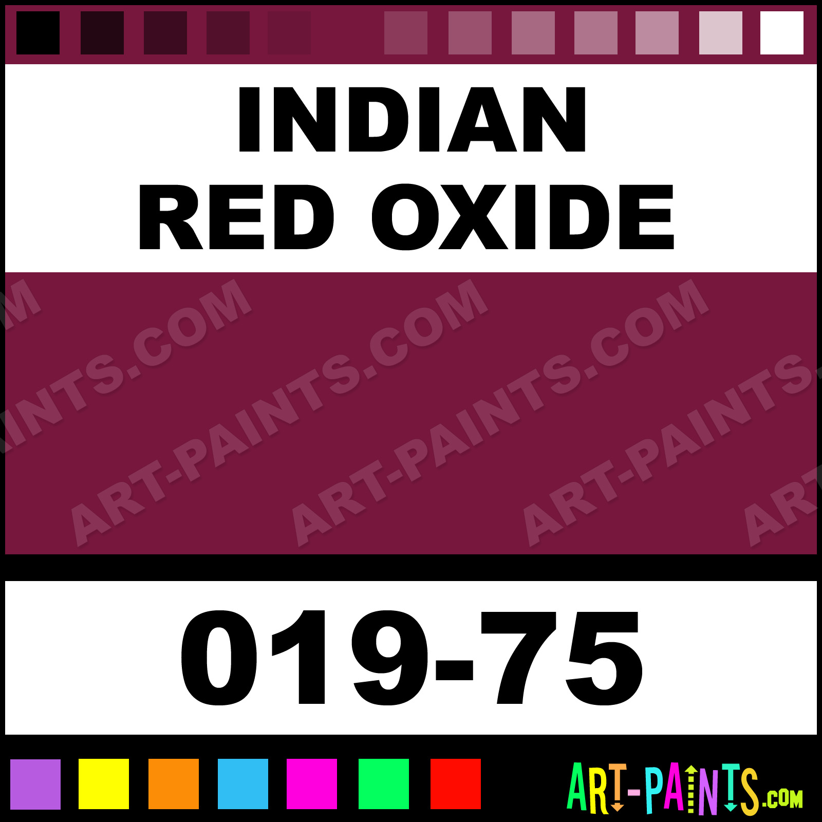 This beautiful Artists Colors Metal or Metallic Paint shade is called Indian Red Oxide, and comes from a company called Jo Sonja. Their product number, along with the HTML color code, RGB, and CMYK codes are listed below. This Beautiful Shade of Indian Red Oxide and others can be found in the Jo Sonja Artists Colors Art Paint Gallery! Also be sure to browse through the other wonderful Professional Color Galleries to see more of Jo Sonja Artists Colors Metal Paints and other Metal and Metallic Paint Manufacturers.   -Art-Paints.com
