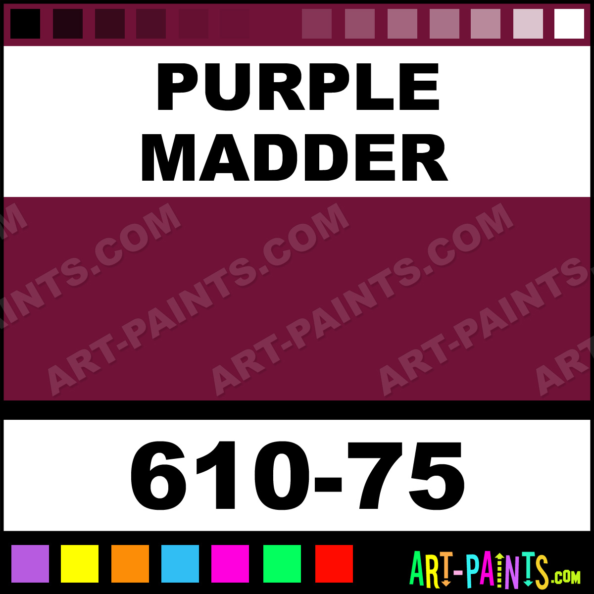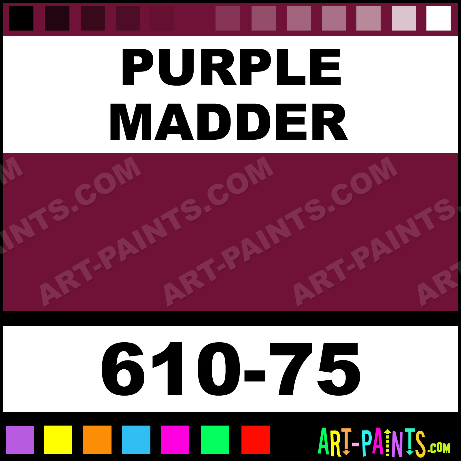 This beautiful Artists Colors Metal or Metallic Paint shade is called Purple Madder, and comes from a company called Jo Sonja. Their product number, along with the HTML color code, RGB, and CMYK codes are listed below. This Beautiful Shade of Purple Madder and others can be found in the Jo Sonja Artists Colors Art Paint Gallery! Also be sure to browse through the other wonderful Professional Color Galleries to see more of Jo Sonja Artists Colors Metal Paints and other Metal and Metallic Paint Manufacturers.   -Art-Paints.com