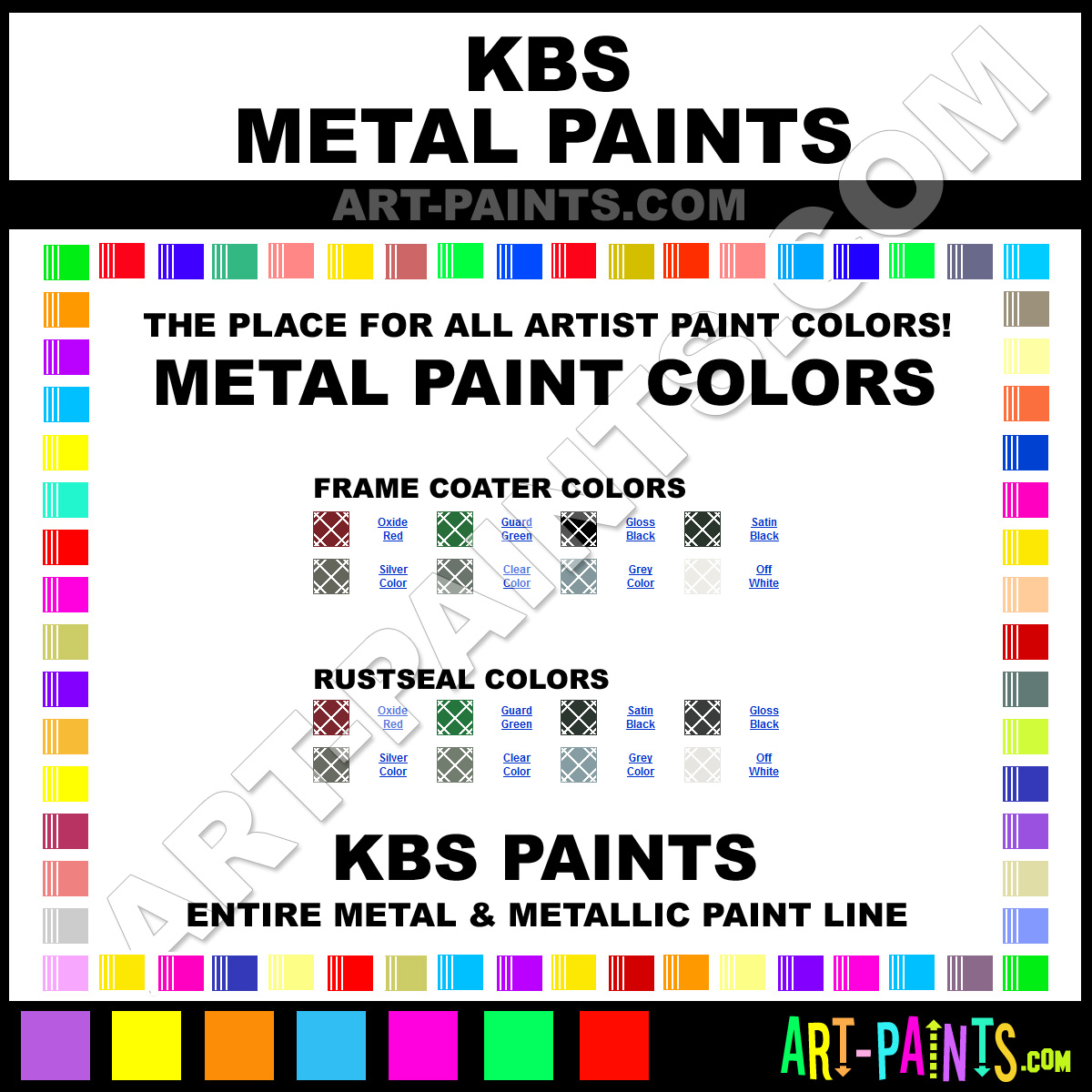 KBS knows Metal and Metallic Paints! They make wonderful brands of Paint for all types of artists. They strive to perfect the process of color and are one of the most popular Metal Paint Brand companies in the world. Whether this Paint is used for Metal Surfaces or just giving a Metallic look, you're sure to enjoy their entire collection. KBS makes a couple different types of Metal Paints including its Frame Coater Paints and its RustSeal Paints! Choose an Metal Paint type below to view that Brand and Colors and Hues.     -Art-Paints.com