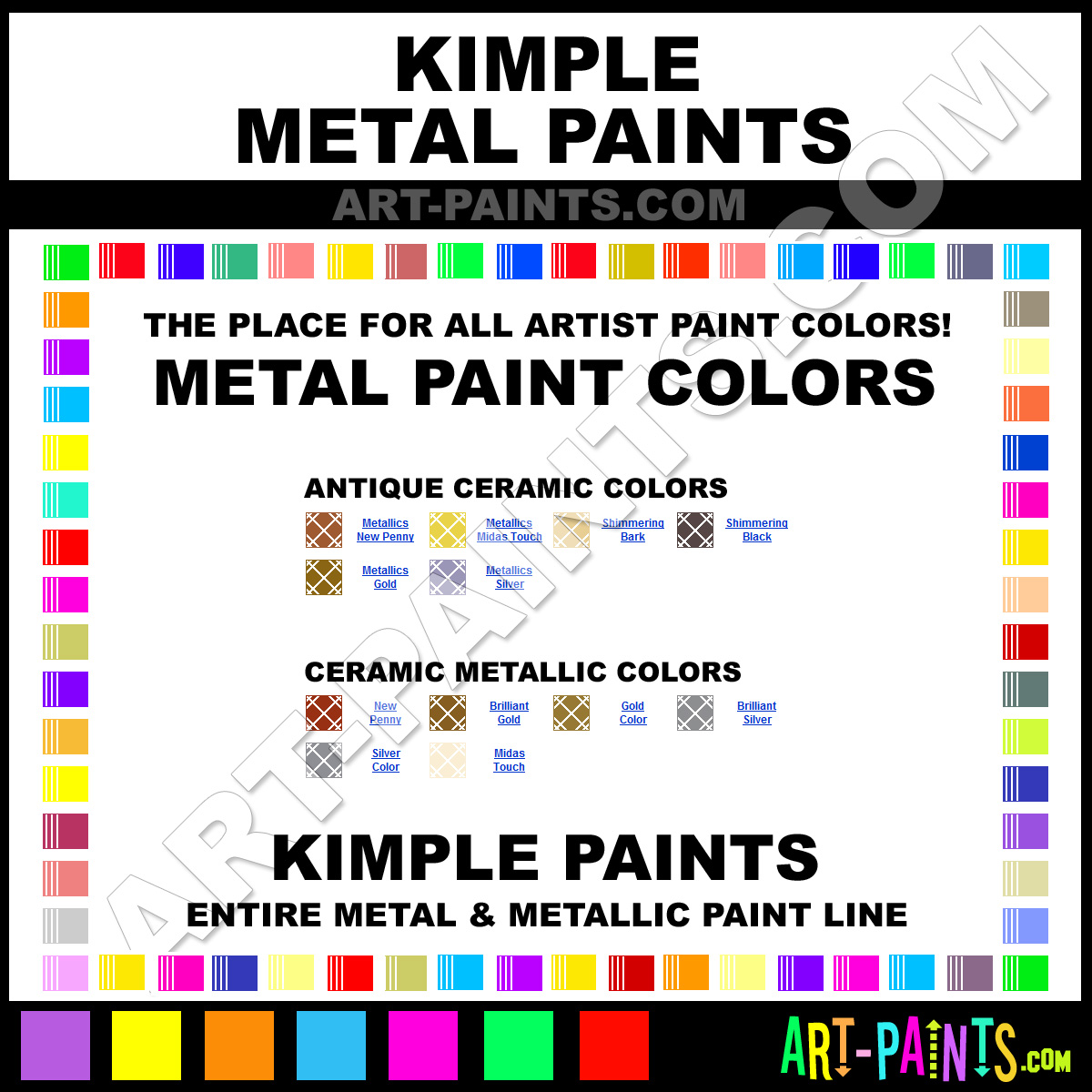 Kimple makes beautiful Metal Paint brands and Metallic Paints. With a complete line of Antique Ceramic Paints and Ceramic Metallic Metal Paint Lines, with 12 colors in all, available in just about every Metal and Metallic hue and color, they will no doubt keep you painting and smiling at the same time. Each Brand is unique and the variety of paints is exquisite!