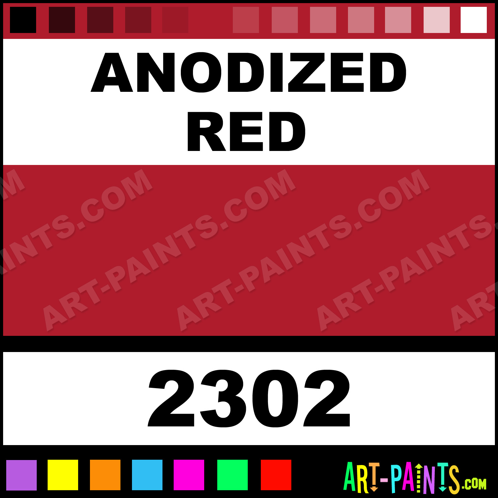 This beautiful X Metals Metal Paint Color shade is called Anodized Red, and comes from a company called Krylon. Their product number, along with the HTML color code, RGB, and CMYK codes are listed below. This Beautiful Shade of Anodized Red and other Metal and Metallic Paint Colors can be found in the Krylon X Metals Art Paint Gallery! Also be sure to browse through the other wonderful Professional Paint Color Galleries to see more of Krylon X Metals Metal Paints and other Metallic Paint Manufacturers.   -Art-Paints.com