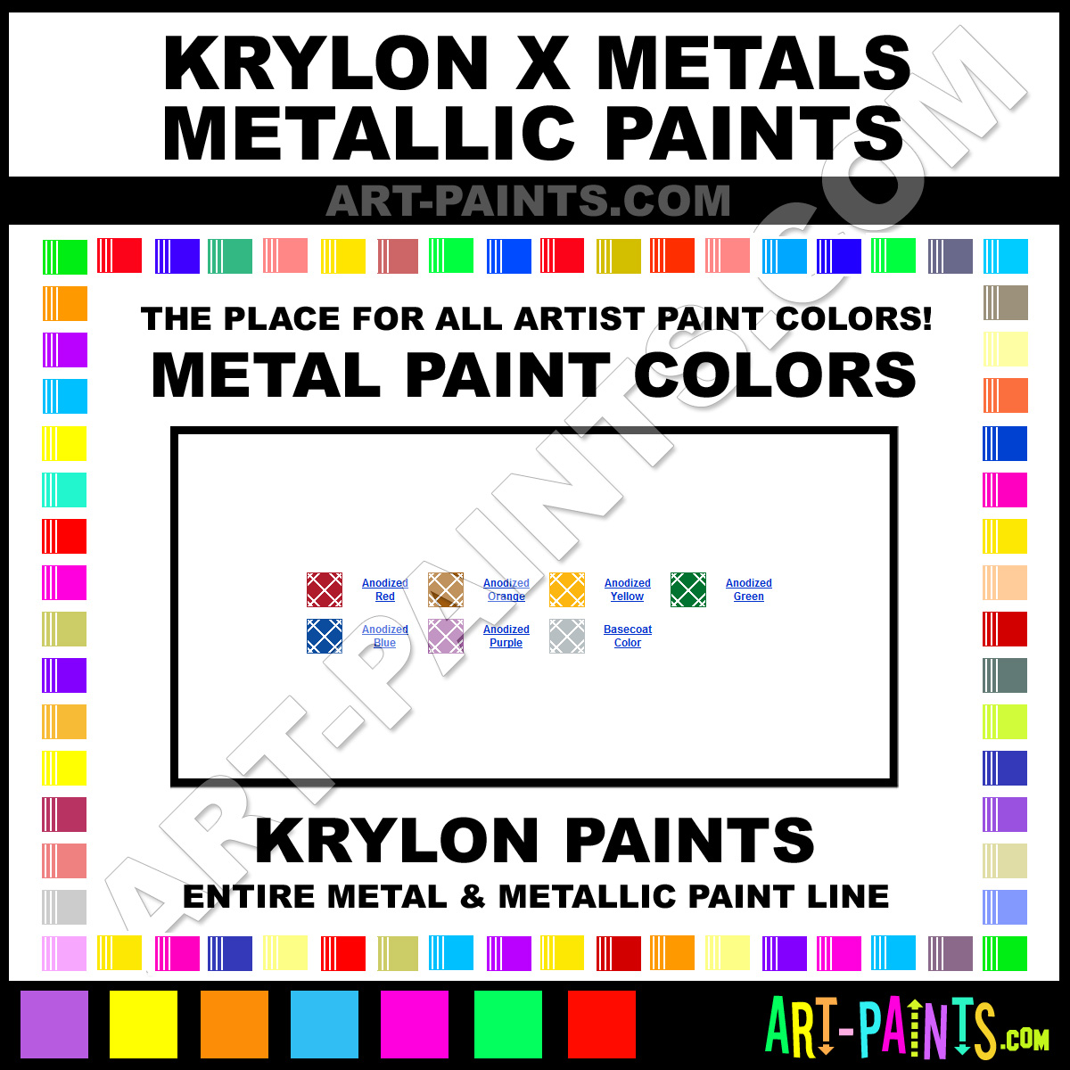 Krylon knows Metal Paints! They make a wonderful brand of Paint called Krylon X Metals Metal Paint Colors that suits all types of artists. They strive to perfect the process of color, good for Metal surfaces or good for giving you that Metallic look! They are one of the most popular Metal Paint Brand companies in the world. Enjoy their entire paint brand collection below. Krylon makes wonderful Artists Metal and Metallic Paints that everyone is sure to enjoy! Choose an Metal Paint Color below to view that Hue and Colors.     -Art-Paints.com