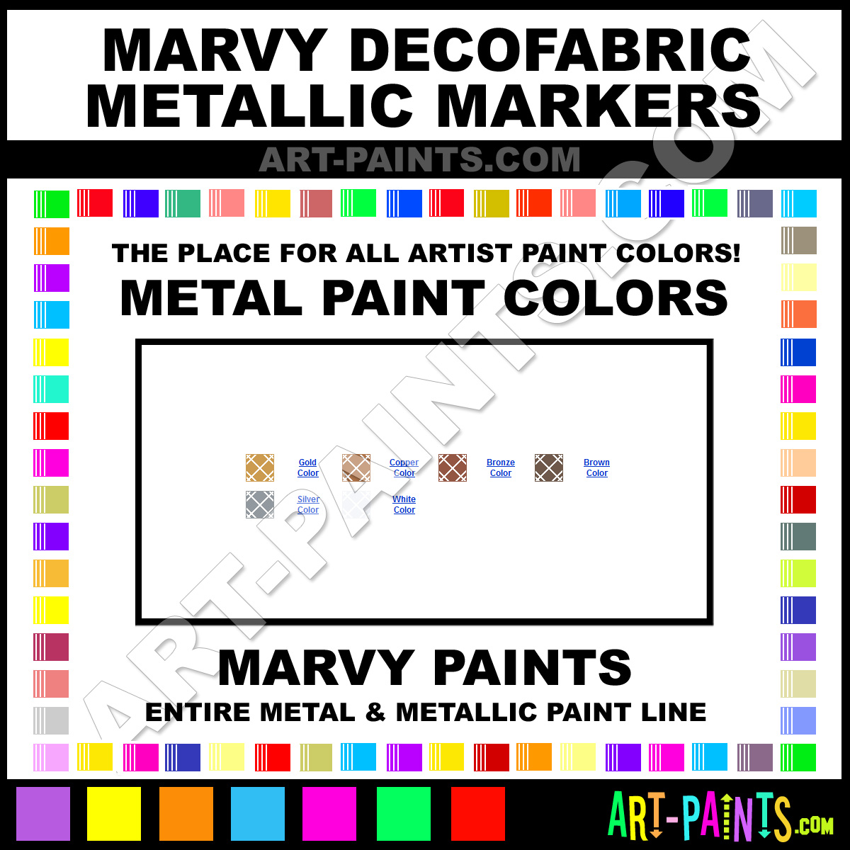 Marvy knows Metal Paints! They make a wonderful brand of Paint called Marvy DecoFabric Metallic Marker Metal Paint Colors that suits all types of artists. They strive to perfect the process of color, good for Metal surfaces or good for giving you that Metallic look! They are one of the most popular Metal Paint Brand companies in the world. Enjoy their entire paint brand collection below. Marvy makes wonderful Artists Metal and Metallic Paints that everyone is sure to enjoy! Choose a Metal Paint Color below to view that Color.     -Art-Paints.com