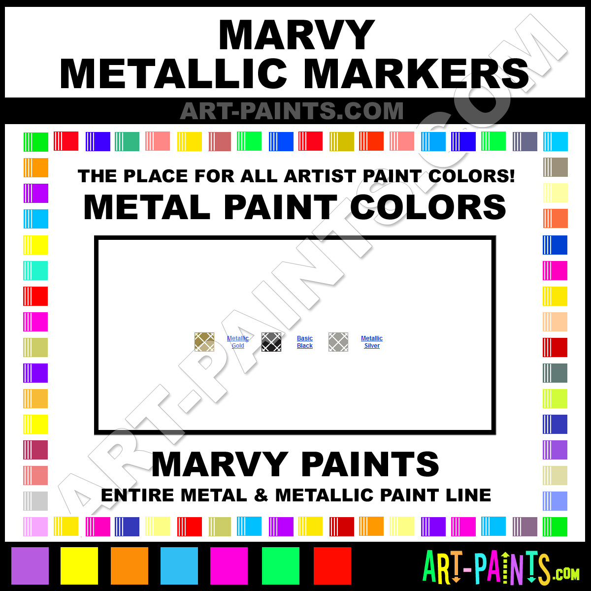 Marvy knows Metal Paints! They make a wonderful brand of Paint called Marvy Metallic Markers Metal Paint Colors that suits all types of artists. They strive to perfect the process of color, good for Metal surfaces or good for giving you that Metallic look! They are one of the most popular Metal Paint Brand companies in the world. Enjoy their entire paint brand collection below. Marvy makes wonderful Artists Metal and Metallic Paints that everyone is sure to enjoy! Choose an Metal Paint Color below to view that Hue and Colors.     -Art-Paints.com