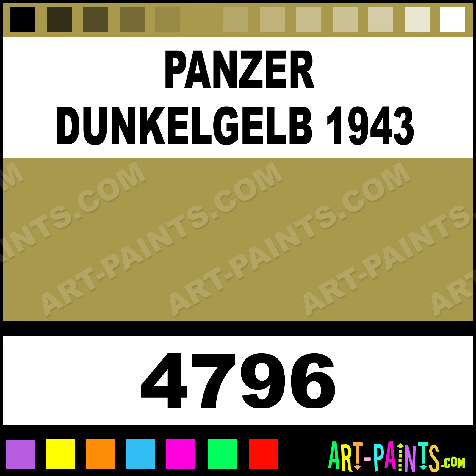 This beautiful Artist Metal Paint Color shade is called Panzer Dunkelgelb 1943, and comes from a company called Model Master. Their product number, along with the HTML color code, RGB, and CMYK codes are listed below. This Beautiful Shade of Panzer Dunkelgelb 1943 and other Metal and Metallic Paint Colors can be found in the Model Master Artist Art Paint Gallery! Also be sure to browse through the other wonderful Professional Paint Color Galleries to see more of Model Master Artist Metal Paints and other Metallic Paint Manufacturers.   -Art-Paints.com
