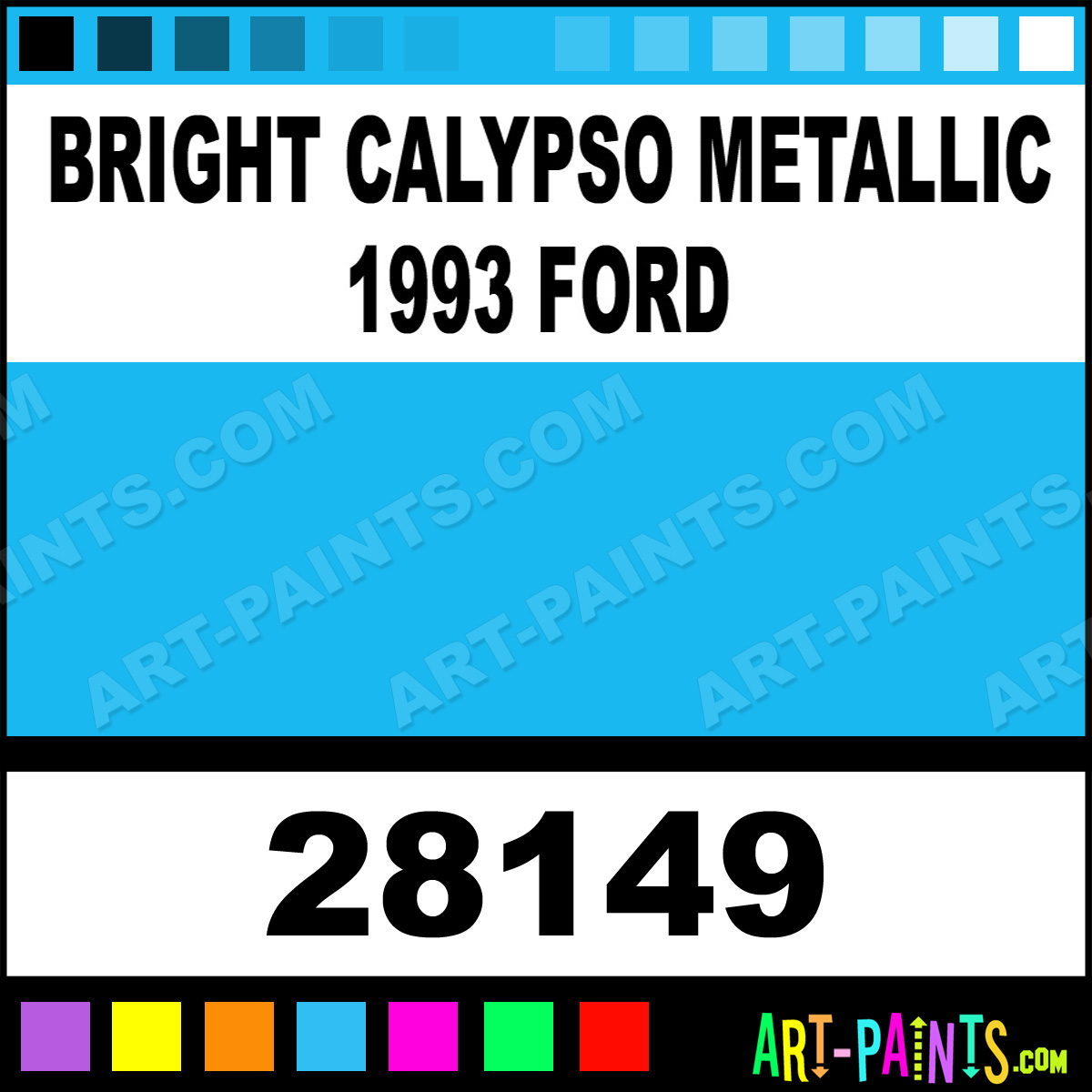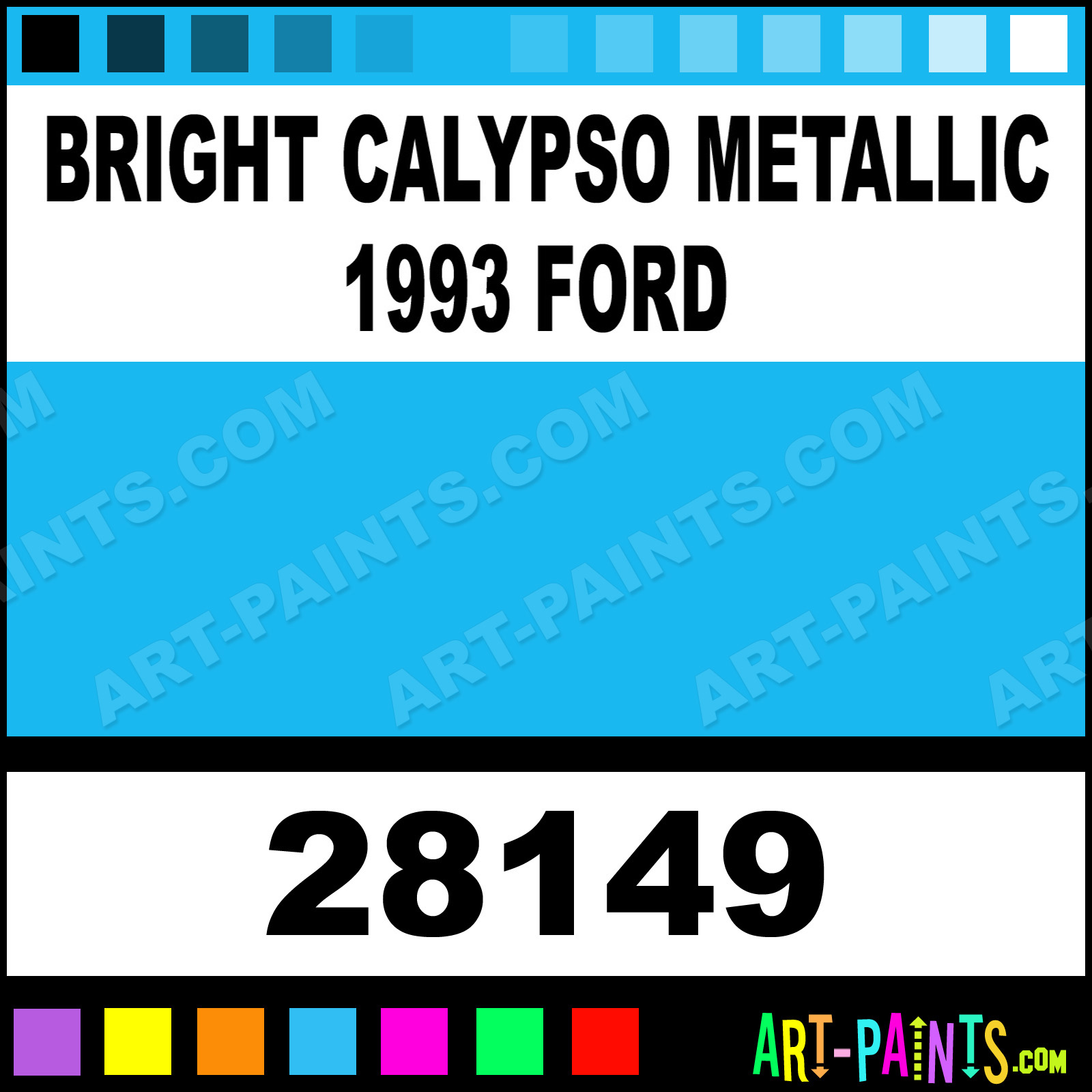 This beautiful Model Metal Paint Color shade is called Bright Calypso Metallic 1993 Ford, and comes from a company called Model Master. Their product number, along with the HTML color code, RGB, and CMYK codes are listed below. This Beautiful Shade of Bright Calypso Metallic 1993 Ford and other Metal and Metallic Paint Colors can be found in the Model Master Model Art Paint Gallery! Also be sure to browse through the other wonderful Professional Paint Color Galleries to see more of Model Master Model Metal Paints and other Metallic Paint Manufacturers.   -Art-Paints.com