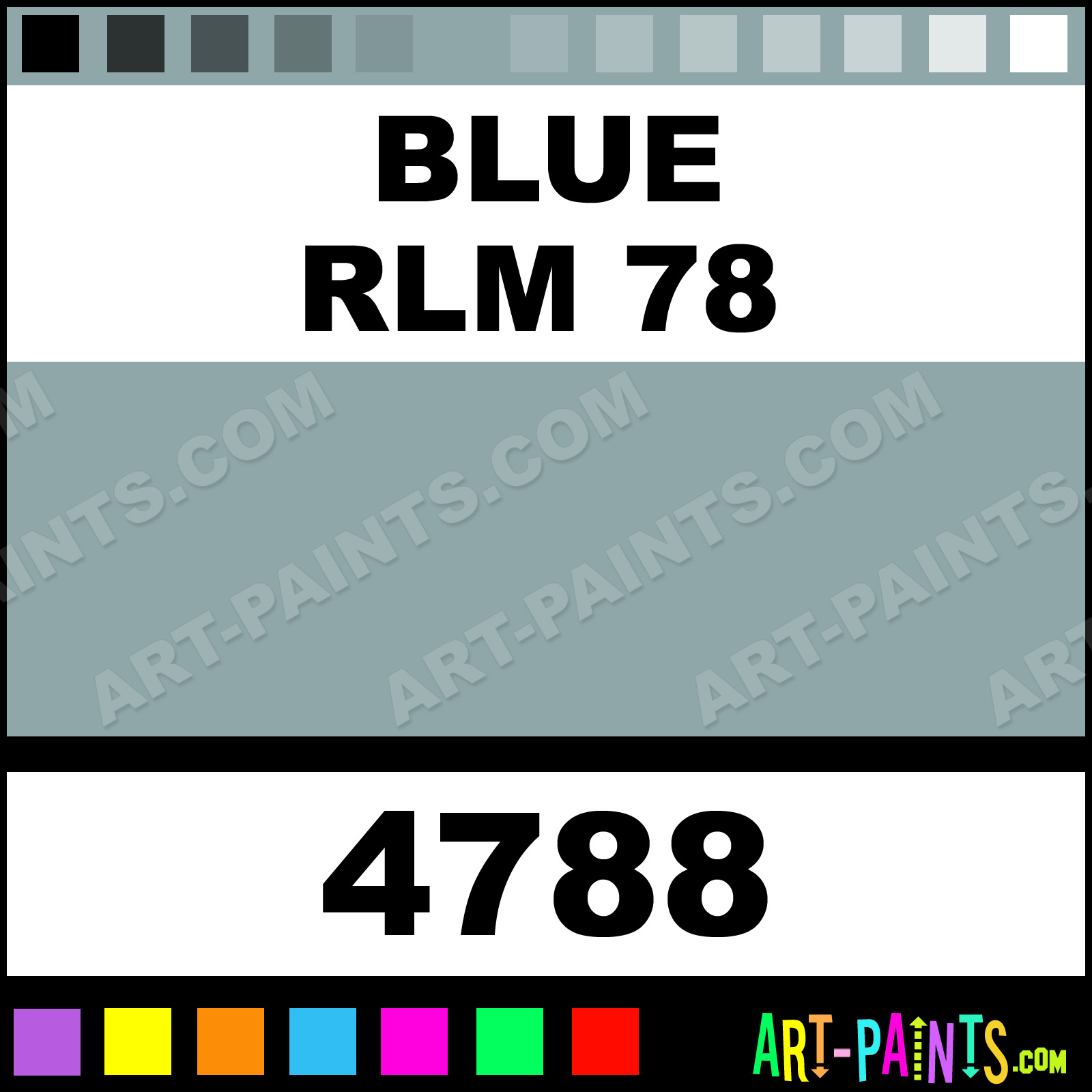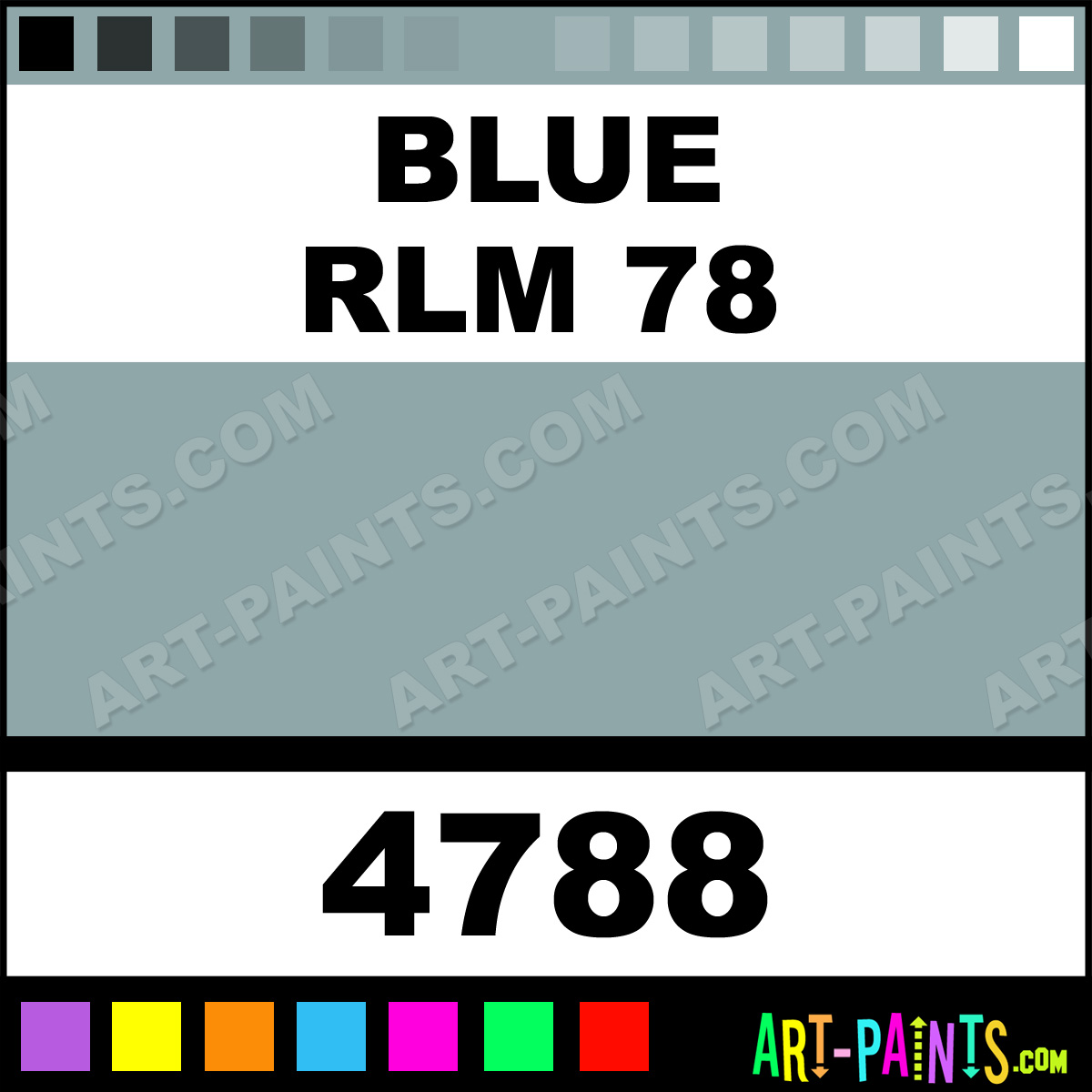 This beautiful Testors Metal Paint Color shade is called Blue RLM 78, and comes from a company called Model Master. Their product number, along with the HTML color code, RGB, and CMYK codes are listed below. This Beautiful Shade of Blue RLM 78 and other Metal and Metallic Paint Colors can be found in the Model Master Testors Art Paint Gallery! Also be sure to browse through the other wonderful Professional Paint Color Galleries to see more of Model Master Testors Metal Paints and other Metallic Paint Manufacturers.   -Art-Paints.com